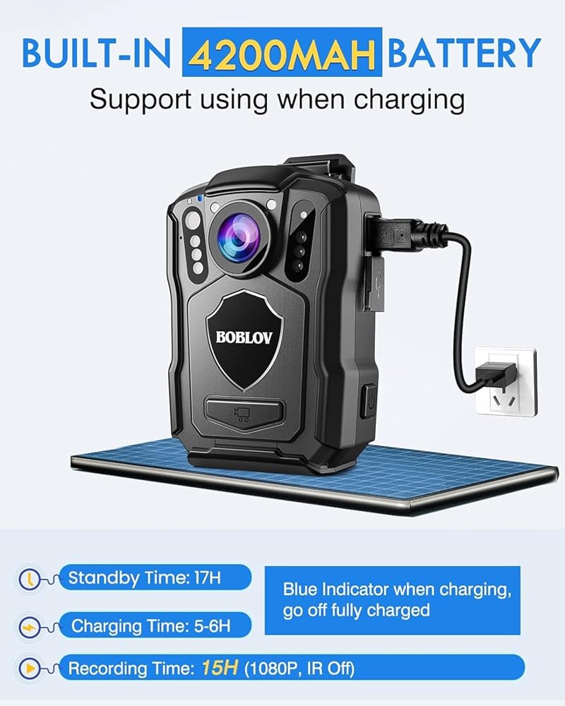 • 【 كاميرا داخلية بذاكرة داخلية سعة 128 جيجابايت】احصل على كاميرات الجسم الشخصية، وبطاقة TF مدمجة بذاكرة كبيرة بسعة 256 جيجابايت للاستخدام الجاهز. تضمن الذاكرة ذات السعة الكبيرة إمكانية العمل لمدة 8 ساعات مع التسجيل بدوام كامل.