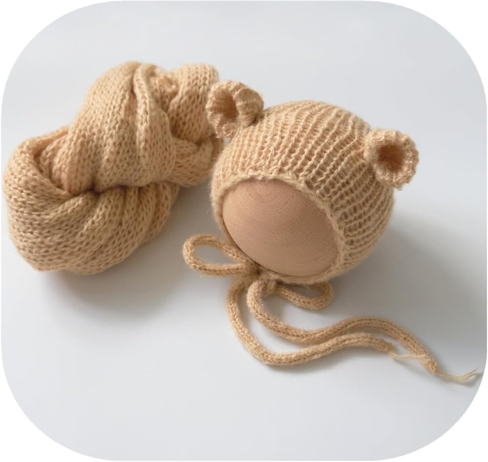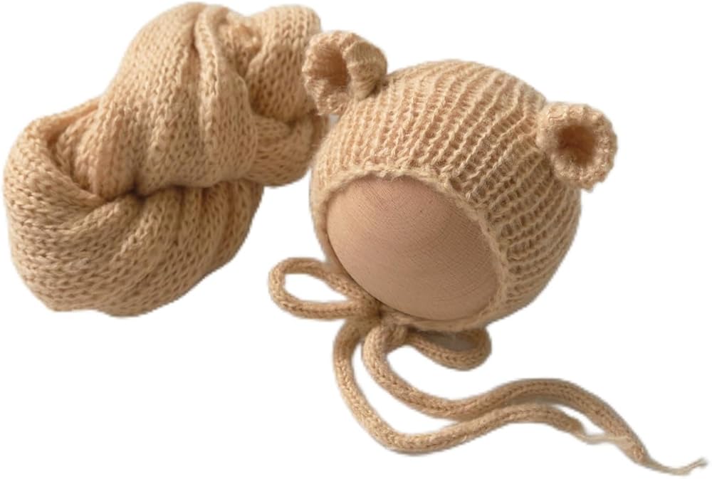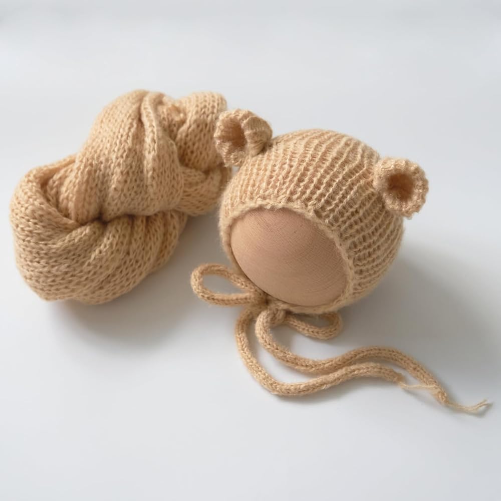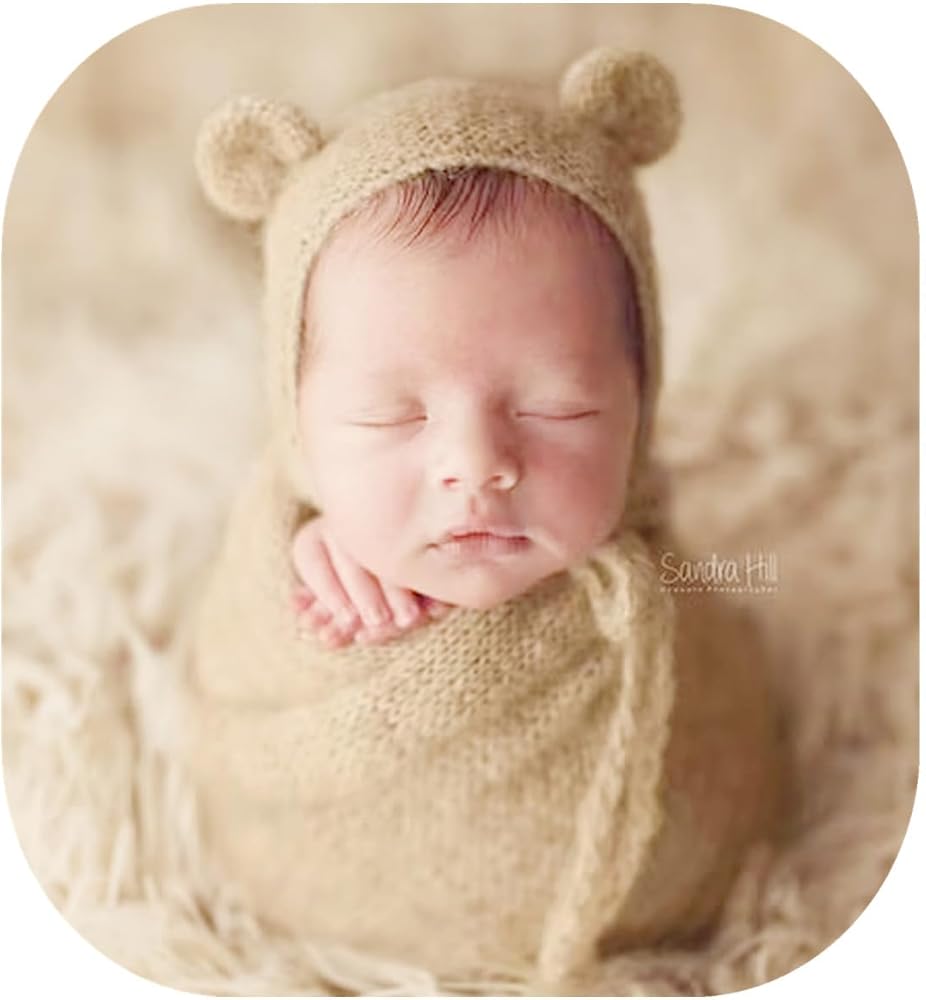 Cute handmade mohair newborn wrap with matching bear bonnet. This newborn bear set is a perfect newborn photo prop outfit