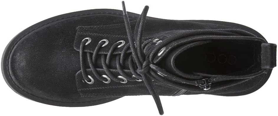 Lace-up and zippered closure.
