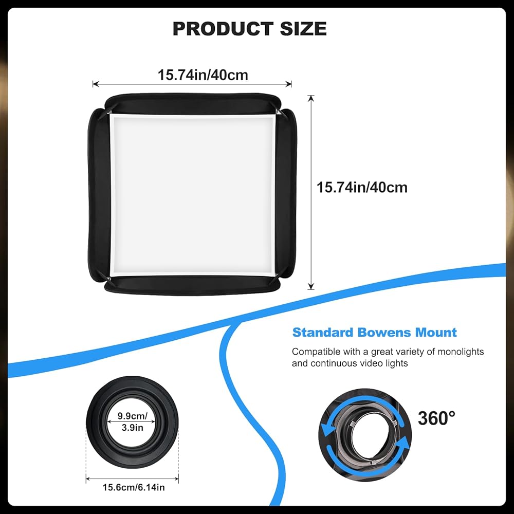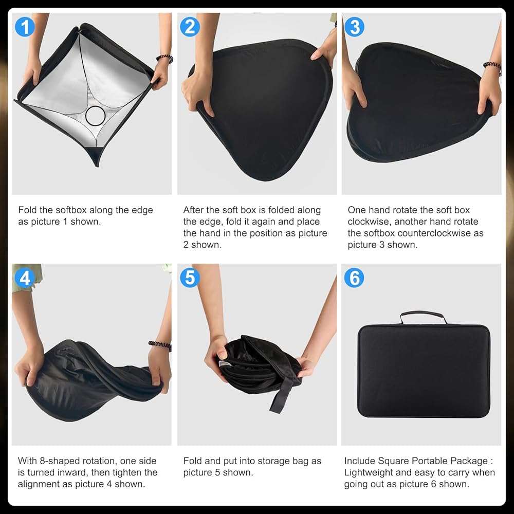 【صناديق لينة قابلة للطي】صناديق لينة قابلة للطي مقاس 40 × 40 سم من CAME-TV سهلة الإعداد والتفكيك مما يوفر مخرجات منتشرة. يحتوي الجزء الداخلي من الصندوق الناعم على سطح عاكس للغاية يرتد الضوء من خلال لوحة (لوحات) الانتشار. يحتوي كل صندوق ناعم على زوج من ألواح التوزيع، واحدة خارجية وداخلية. في معظم الحالات، ستكون اللوحة الخارجية كافية لتوفير ضوء منتشر لطيف ويمكن إضافة الضوء الداخلي لتوفير مخرجات أكثر انتشارًا