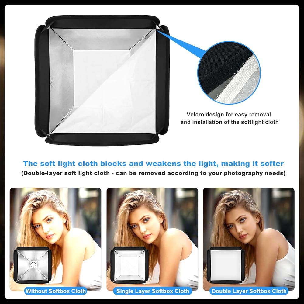 【انتشار أبيض قابل للفصل】تخلق لوحة (ألواح) التوزيع المستخدمة في الصندوق الناعم إضاءة جميلة وناعمة، مما يقضي على الظلال القاسية ويعزز الجودة العامة لصورك. لتكون فعالة بشكل خاص في التصوير الفوتوغرافي للصور الشخصية ولقطات المنتج