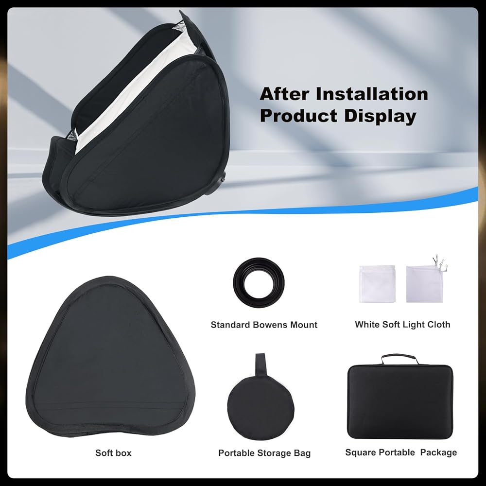 【سهلة التجميع وصغيرة الحجم ومحمولة】كانت إضاءة Softbox مقاس 40 سم × 40 سم سهلة بما يكفي لإعداد الكل في واحد، وحجم أصغر، وتصميم محمول، وتوفير المساحة، وعدم التجميع/التفكيك، ونظام تركيب سهل. التصميم القابل للطي، المكتمل بغطاء تخزين، يجعل هذا الصندوق الناعم مناسبًا للسفر. إنه خيار رائع للمصورين ومصوري الفيديو أثناء التنقل
