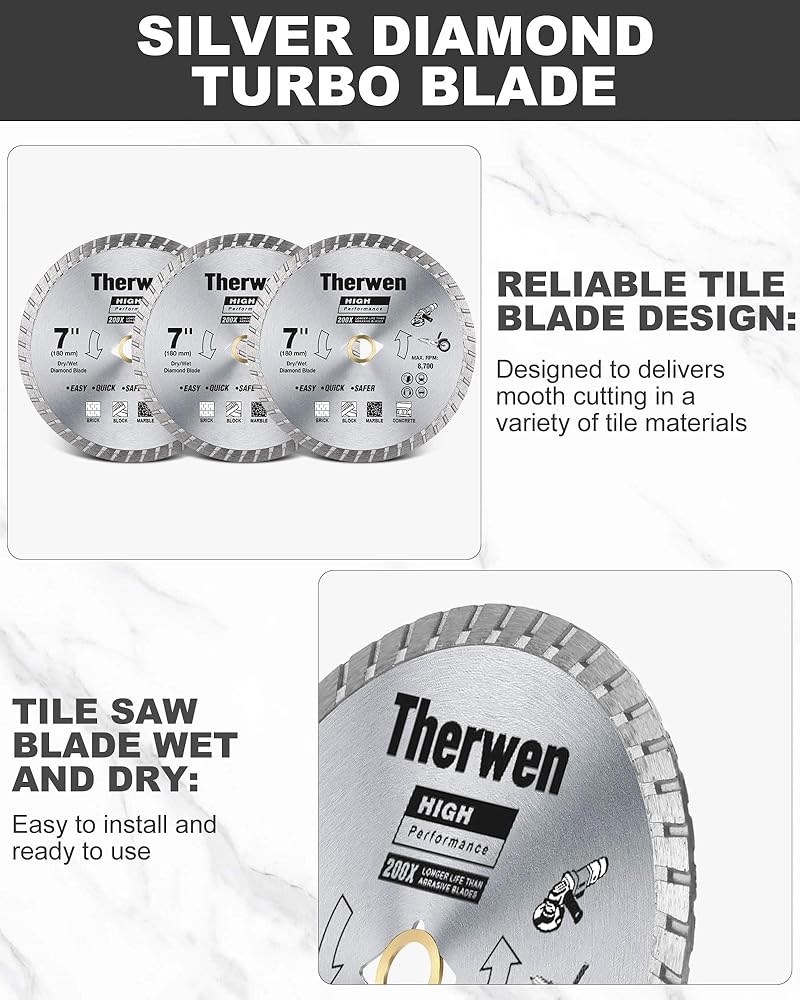Silver Diamond Turbo Blade: you will get 6 tile blades, cutting disc size is about 4.53 x 0.88 inches/ 115 x 22.33 mm, outer diameter: 4.5 inches/ 115 mm; Diamond Cutting Wheel adopts advance pressing process, more quantities and higher-grade diamonds provide more efficient cutting and extra longer service life, and require quality blades and quality cutting blades to provide you with a fast, precise, and smooth, and no chip cutting experience; And it will not harm your tiles, nor will it break