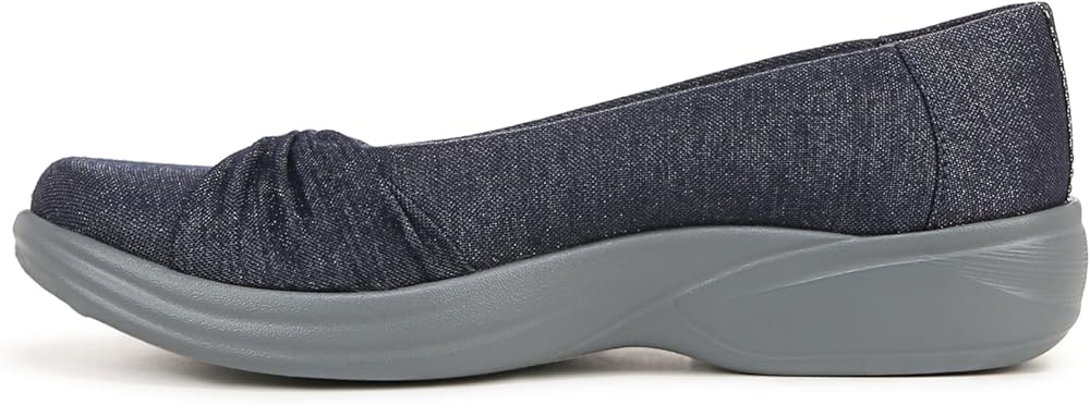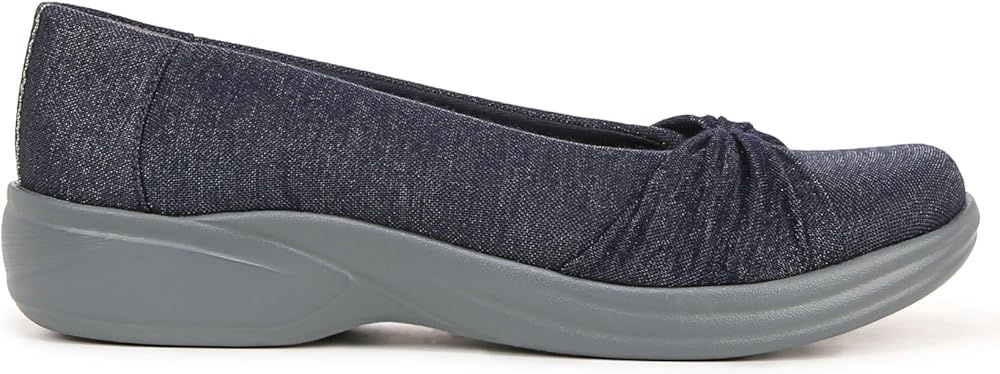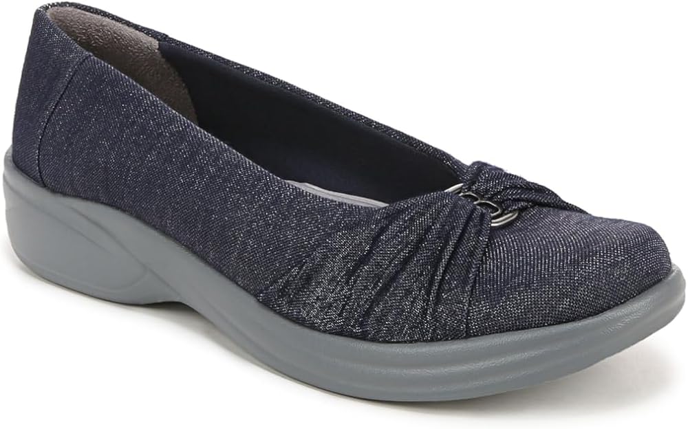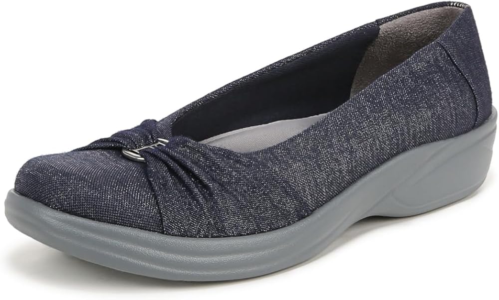 Ease into slip-ins that bring comfort to the everyday! Wear, wash, love. Stretch sparkle fabric upper with partially recycled lining and round toe. Slip-ins for easy on/off. Bzees metallic ornamentation. BLOOM™ materials: Eco-conscious algae-infused foam layer under the insole. BZEES Cloud Technology: Designed so you'll feel weightless, energized and free. Ultra Lightweight: Step lightly with a nearly weightless feel. Dynamic Stretch Fabrics: Move freely in shoes with built-in stretch. FreeFoam™ Comfort: Low pressure insoles with maximum foot contact and cushy arch support. DreamPuff foam padding at the heel. SoCush arch support. . 1 3/8 inch heel. EVA outsole. Get Width It: Countless pairs of Bzees come in wide width shoes for women. Machine Washable: Wash on cold and air dry.