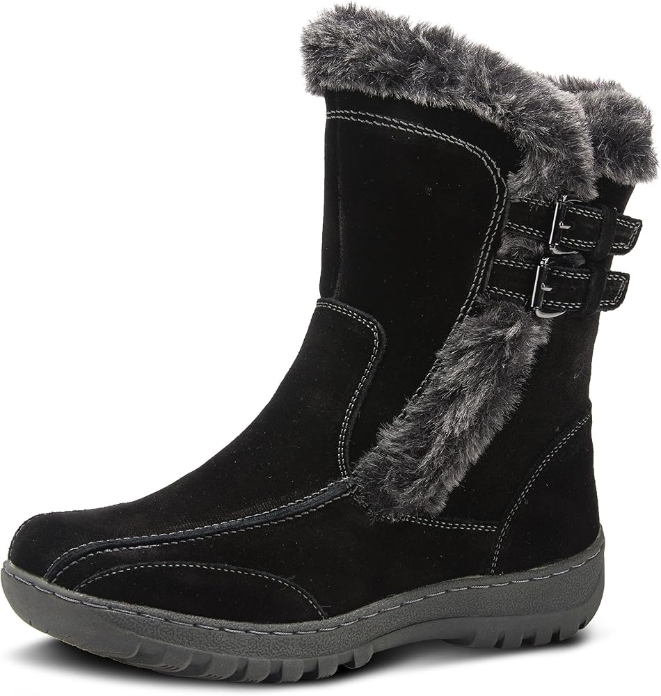 Spring Step Style: Achieve Water resistant, suede cold weather pull-on boot styled with faux fur trim and adjustable buckled straps. Heel Height (approximately): 1 1/2" Shaft Height (approximately): 7" Circumference (approximately): 12" Features: -Round toe, high quality suede, shiny metal buckles, lug sole. -Inside zipper closure. -Faux fur lining. -Faux fur comfort padded insole. -TPR outsole. -Imported.