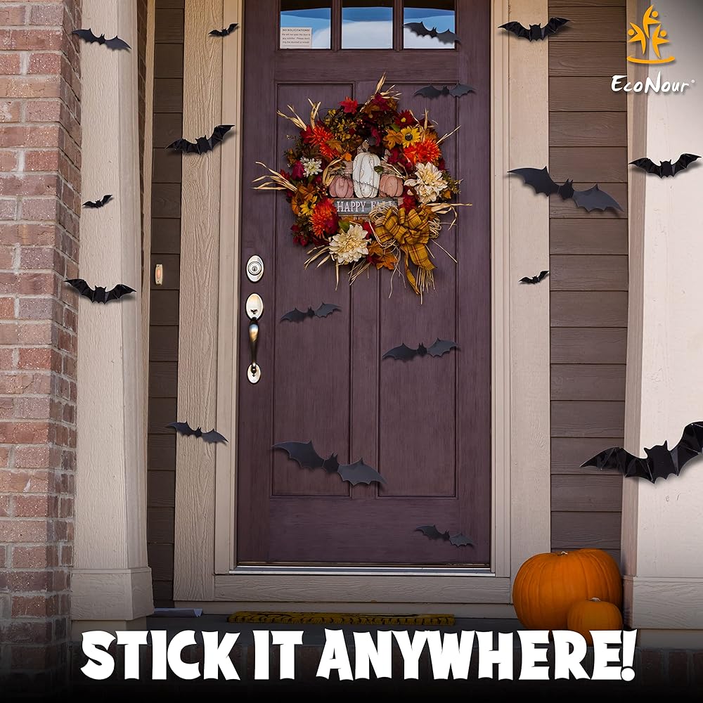تركيب بدون مجهود: ملصقات ديكورات الخفافيش الهالوين من EcoNour سهلة التركيب باستخدام شرائط لاصقة مزدوجة الجوانب مقطوعة مسبقًا. قم بطي الأجنحة، ثم ضع المادة اللاصقة، وأزل الغشاء، ثم قم باللصق! قم بتنظيف منطقة التثبيت من أجل التصاق أفضل.