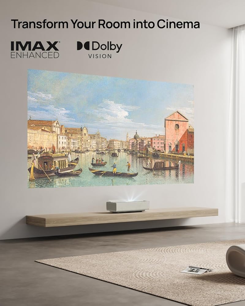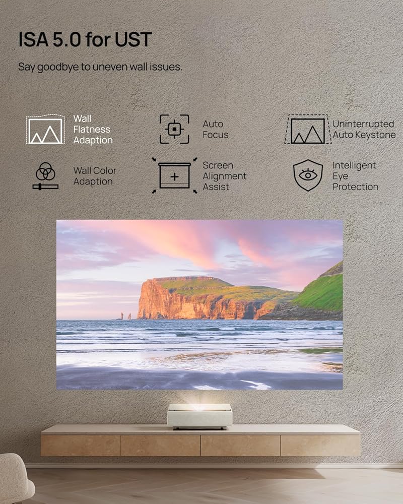تقنية الإسقاط فائق القصر: يمكنك عرض صورة ضخمة على الشاشة مقاس 100 بوصة من مسافة 17.8 سم فقط من الحائط، وذلك بفضل نسبة الإسقاط المتقدمة التي تبلغ 0.177:1، مما يجعلها مثالية لأي حجم غرفة.