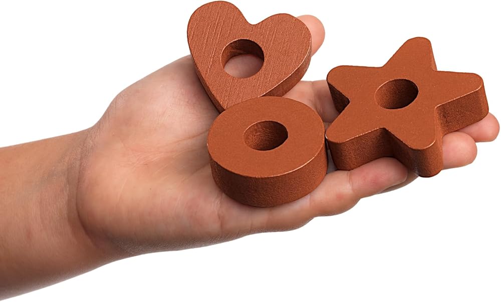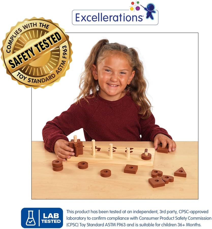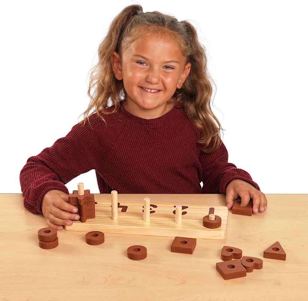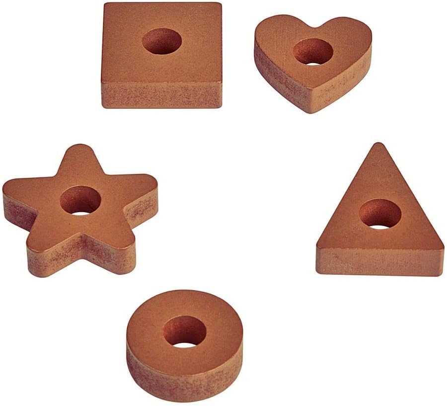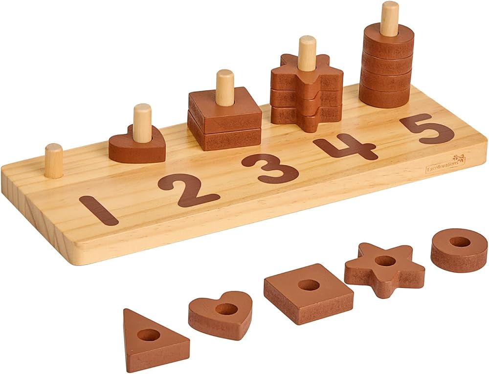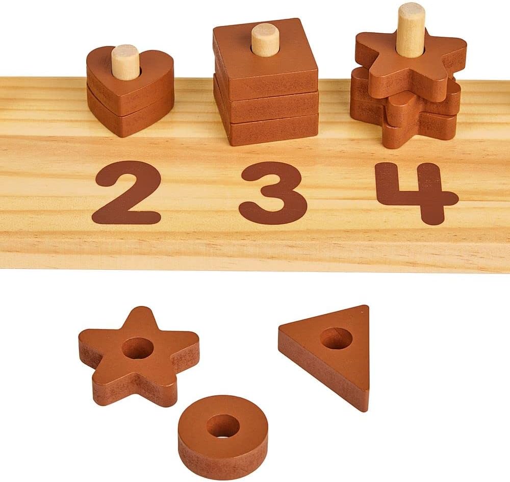 • NATURAL COLORS, STURDY DESIGN: Painted in a natural color palette, the set includes: 1 triangle, 2 hearts, 3 squares, 4 stars, and 5 circles, and a durable wooden board with 5 pegs in graduating sizes