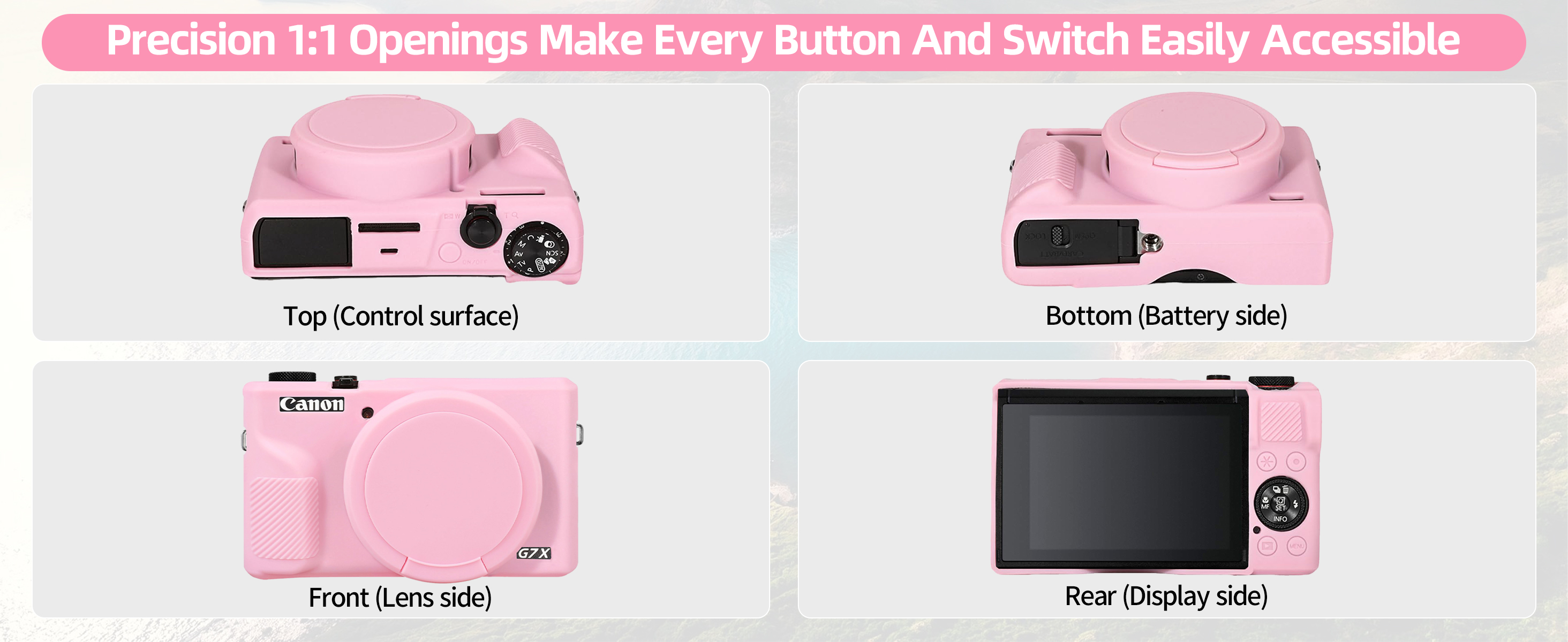 【تصميم ملائم بدقة】 تم تصميم الجراب المصنوع من السيليكون بدقة ليناسب محيط كاميرا Canon Powershot G7X Mark III، مما يضمن ملاءمة محكمة وآمنة. تم قطع فتحات الجراب بدقة للسماح بالوصول الكامل إلى جميع أدوات التحكم في الكاميرا، بما في ذلك شاشة اللمس وزر الغالق وحلقة التكبير، مما يضمن التشغيل دون عوائق. (ملاحظة: G7X II غير قابل للتطبيق)