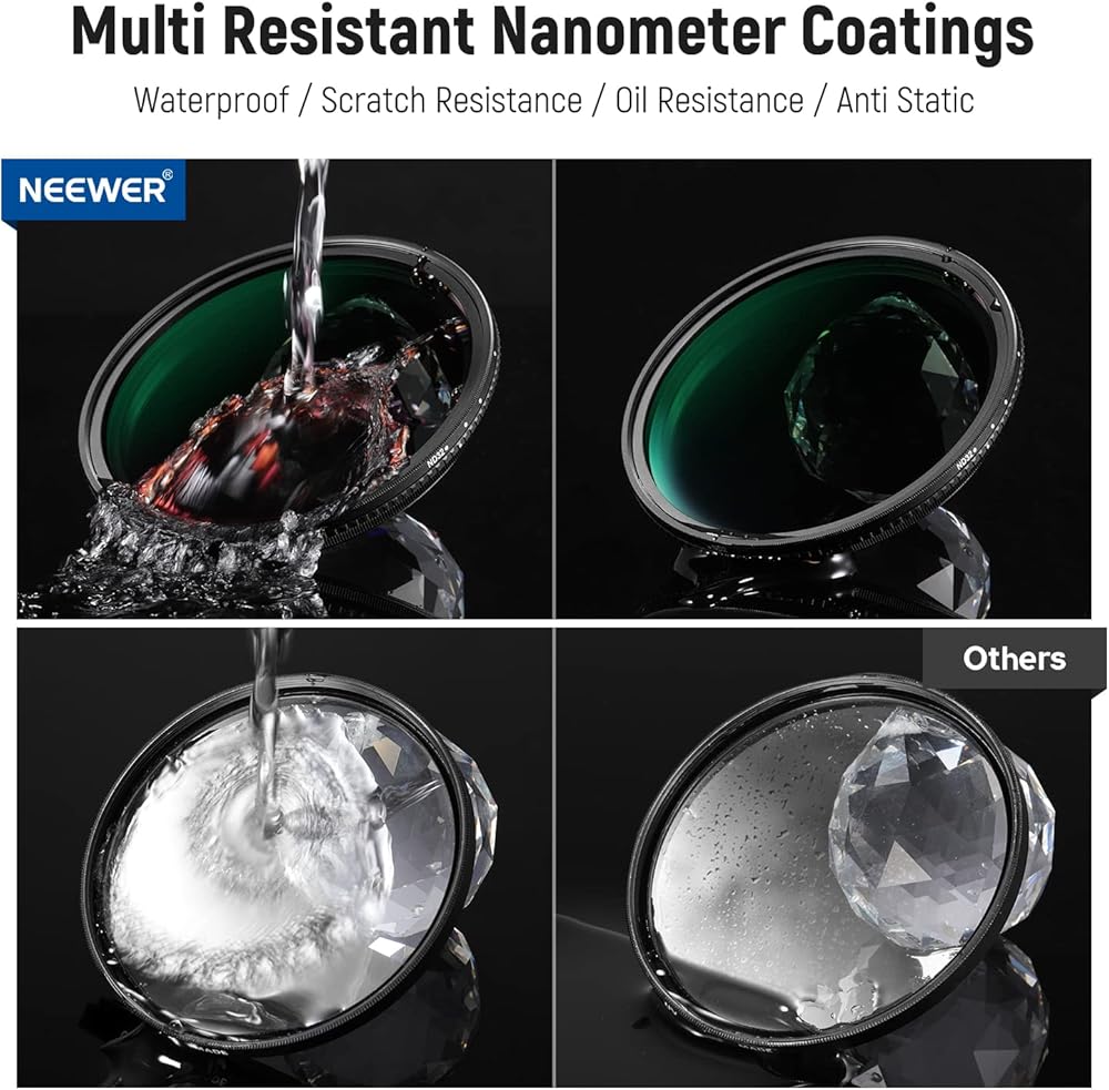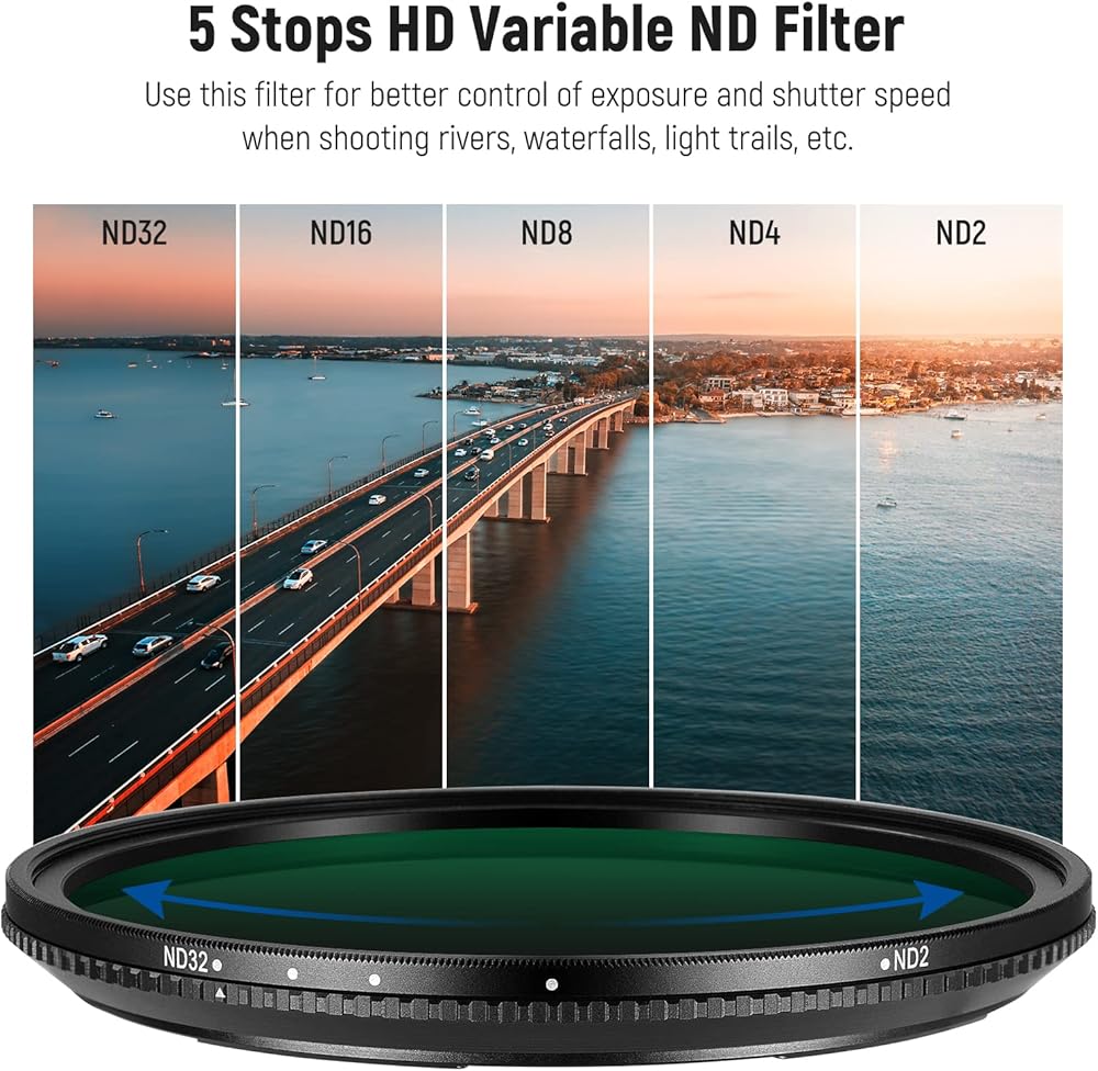 【72mm Variable ND Filter】 NEEWER ND2-ND400 Variable Filter reduces the amount of light reaching the camera sensor, allowing you to shoot in different conditions with slower shutter speeds and wider apertures. It is perfect for capturing rivers, waterfalls, light trails, and other moving objects with dynamic motion blur
