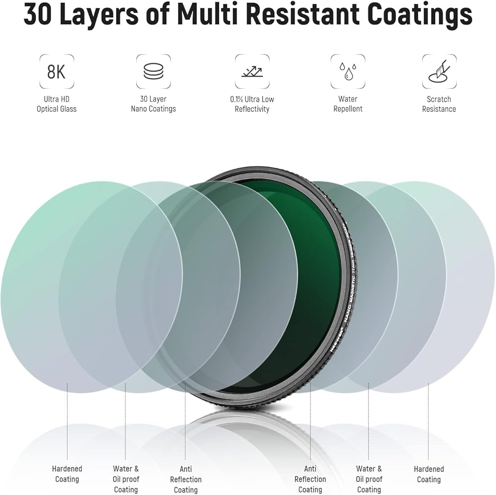 【Dual Sided Multiple Coatings】 Optical glass with multiple coatings on both sides ensures neutral contrast and allows you to take images and videos with high color fidelity. The coatings are water repellent, dustproof, anti fingerprint, and scratch resistant, easy for daily cleaning