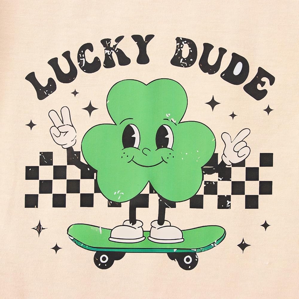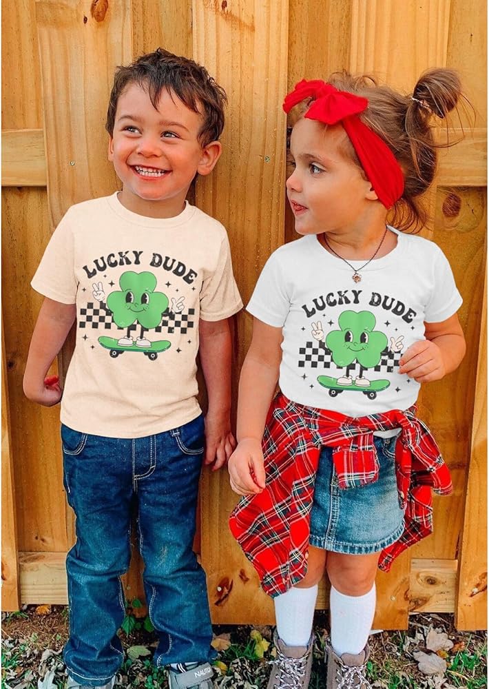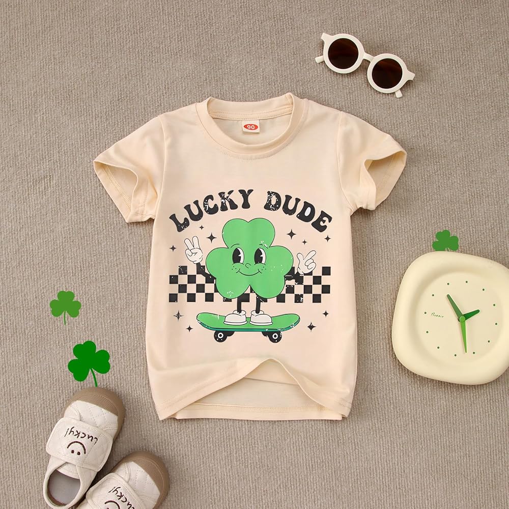 【قميص عيد القديس باتريك للأطفال الصغار】قميص Lucky dude للأطفال الصغار، تي شيرت كلاسيكي لعيد القديس باتريك برقبة دائرية وتصميم قصير الأكمام، مطبوع عليه نبات البرسيم الكلاسيكي وألواح التزلج اللطيفة، يجعل أطفالك يبدون رائعين وجذابين للغاية في الأيام الخضراء!