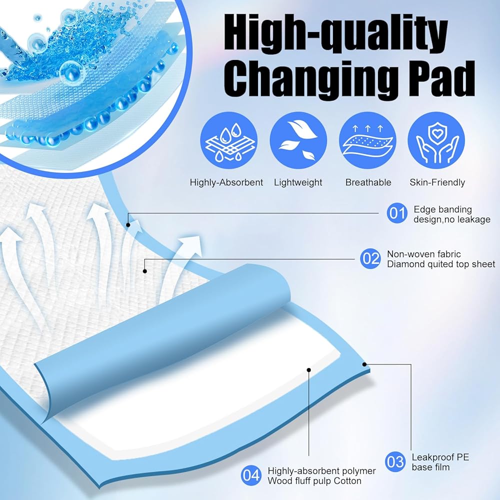 عالية الامتصاص: تتميز وسادات تغيير الحفاضات هذه التي تستخدم لمرة واحدة ببنية متعددة الطبقات مع راتنج عالي الامتصاص الجزيئي لامتصاص الماء بشكل استثنائي. لقد تم تصميمها لتوفير الراحة - ما عليك سوى التخلص منها بعد الاستخدام؛ لا حاجة للغسيل