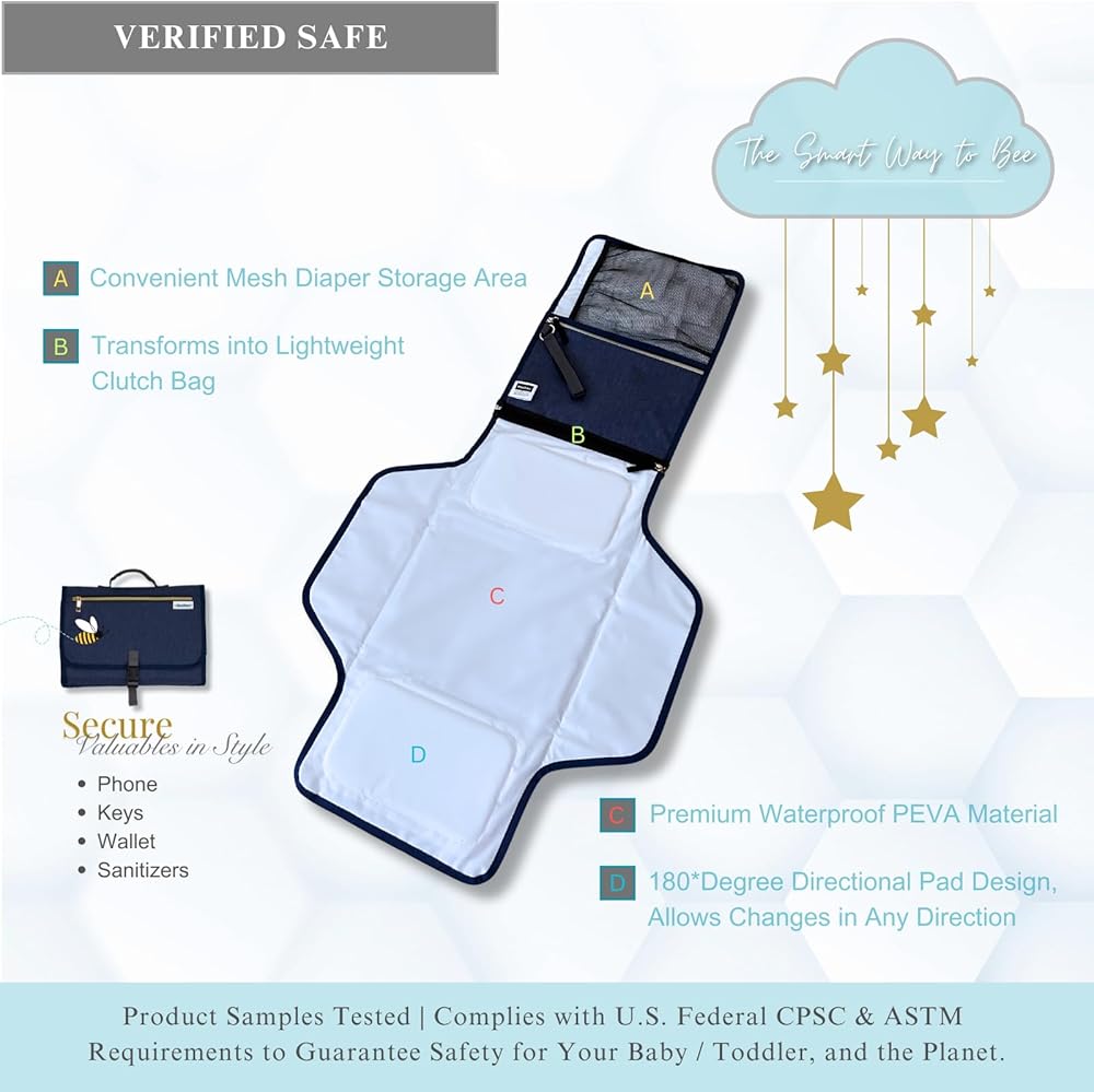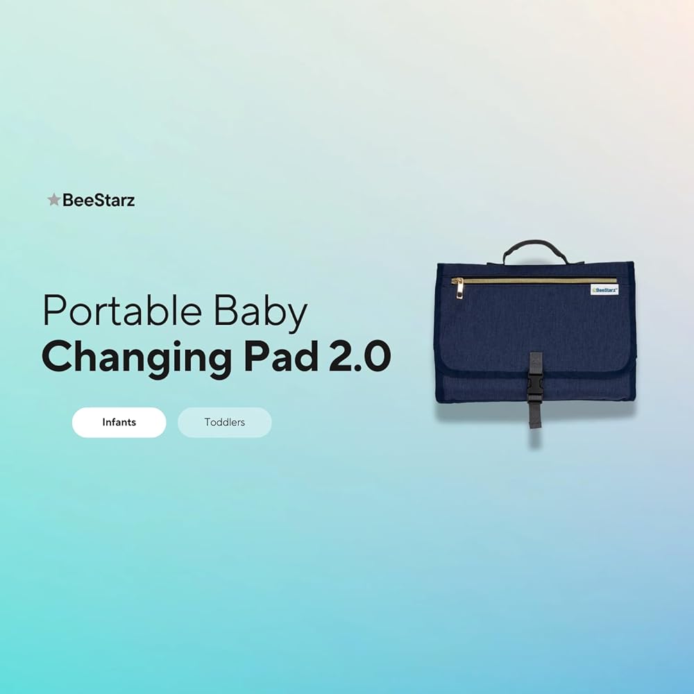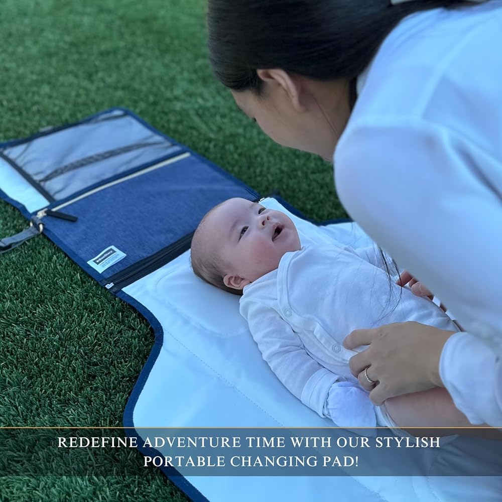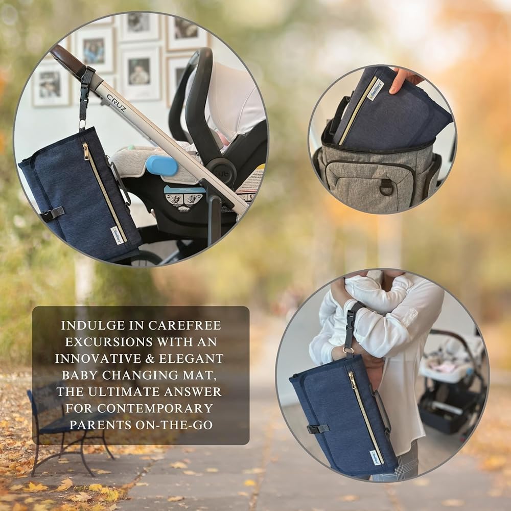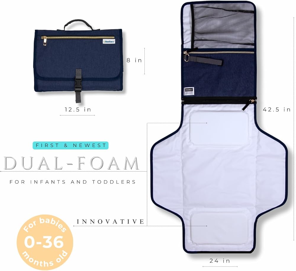 "INDULGE IN CAREFREE EXCURSIONS WITH OUR STYLISH DIAPER CHANGING PAD, THE ULTIMATE ANSWER FOR CONTEMPORARY PARENTS ON THE GO" This product revolutionizes diaper changes with its compact, clean, comfortable, luxurious and INNOVATIVE design. Dual-foam pad design - The portable baby changing pad 2.0 features two memory-foam pads that provide a cushioned barrier, allowing for safe and soft diaper changes in any direction up to the toddler years. Waterproof fabric - Crafted with high-quality polyester and eco-friendly material, this travel changing pad ensures quick cleaning and a dry surface in moments. Convenience on the go - Our travel changing pad folds effortlessly, transforming into a lightweight clutch for seamless portability. Enjoy the freedom of a diaper changing station anywhere you travel. Strong straps / buckle loop - Versatile attachments mean this portable diaper changing station can be affixed to strollers, bags, or wrists, ensuring its always within reach. Optimal gift choice - With its sleek, gender-neutral styling, its a perfect present for any baby shower, pleasing new parents with its practicality and elegance. Designed for babies & toddlers, and appreciated by caregivers. Friendly material - We prioritize your baby's health, using safe, tested materials for peace of mind. Easy clean surface - Spills and messes are easily wiped away, saving precious time. The portable baby changing pad 2.0 stands out for its blend of INNOVATION and comfort, making it a must-have for active families.
