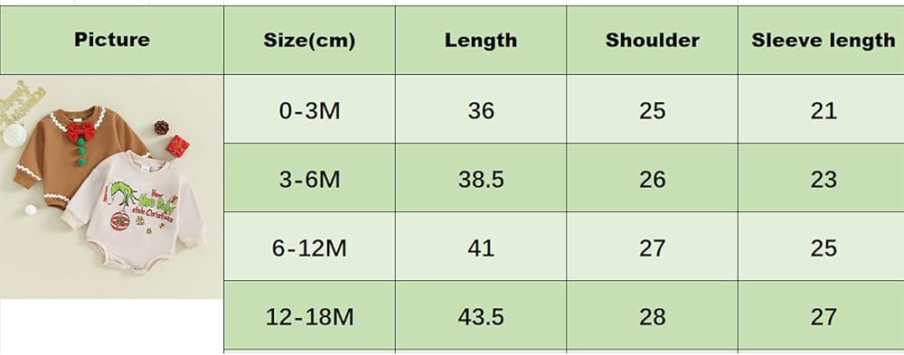 0-3M Length: 14.17 Bust: 22.05 Sleeve: 8.27 Shoulder: 9.84 Advised Age: 0-3 Months
