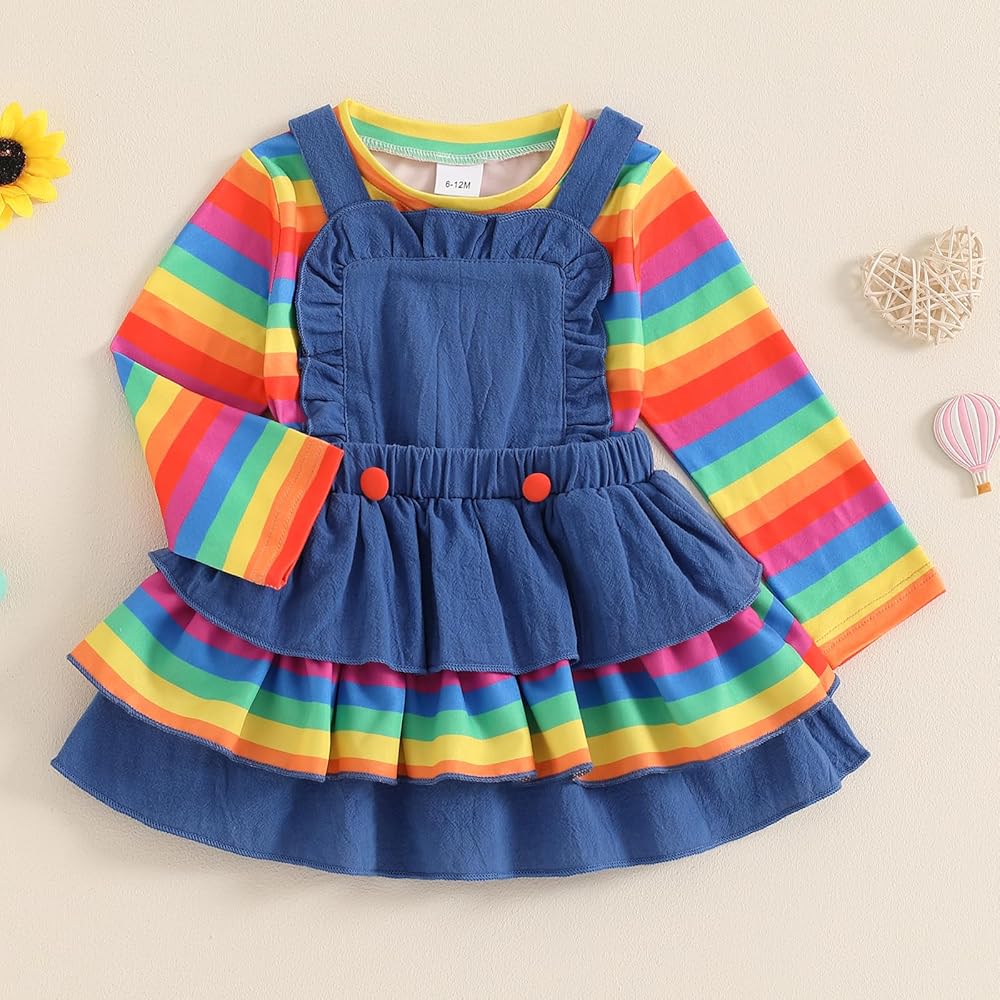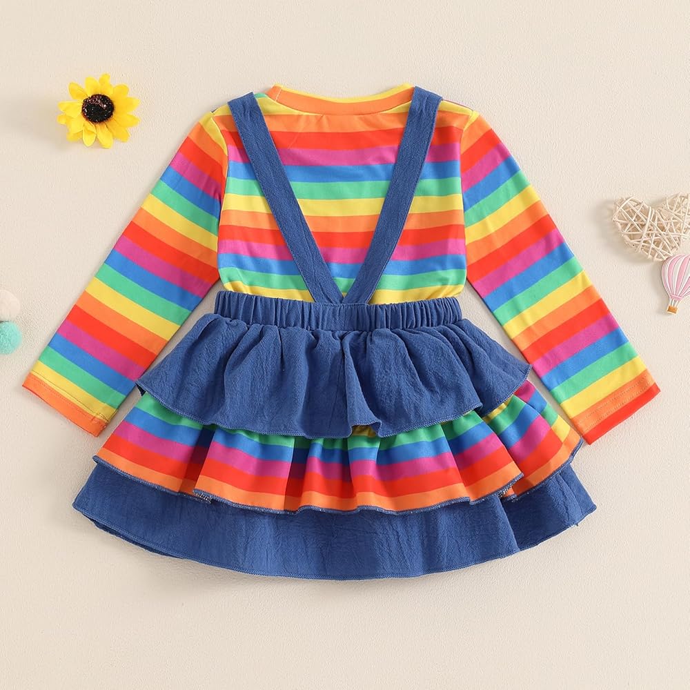 • Features: Long sleeve, paired with contrasting striped, toddler girl suspender skirt features square neck, elastic waist, frill trim, and layered ruffled hem, paired with striped elements for a fashionable look.