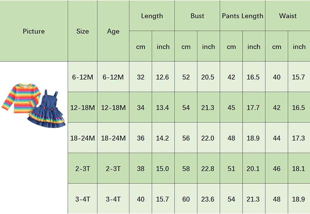 12-18M Tops Length: 13.39 Bust: 21.26 Skirt Length: 17.72 Waist: 16.54 Advised Age: 12-18 Months