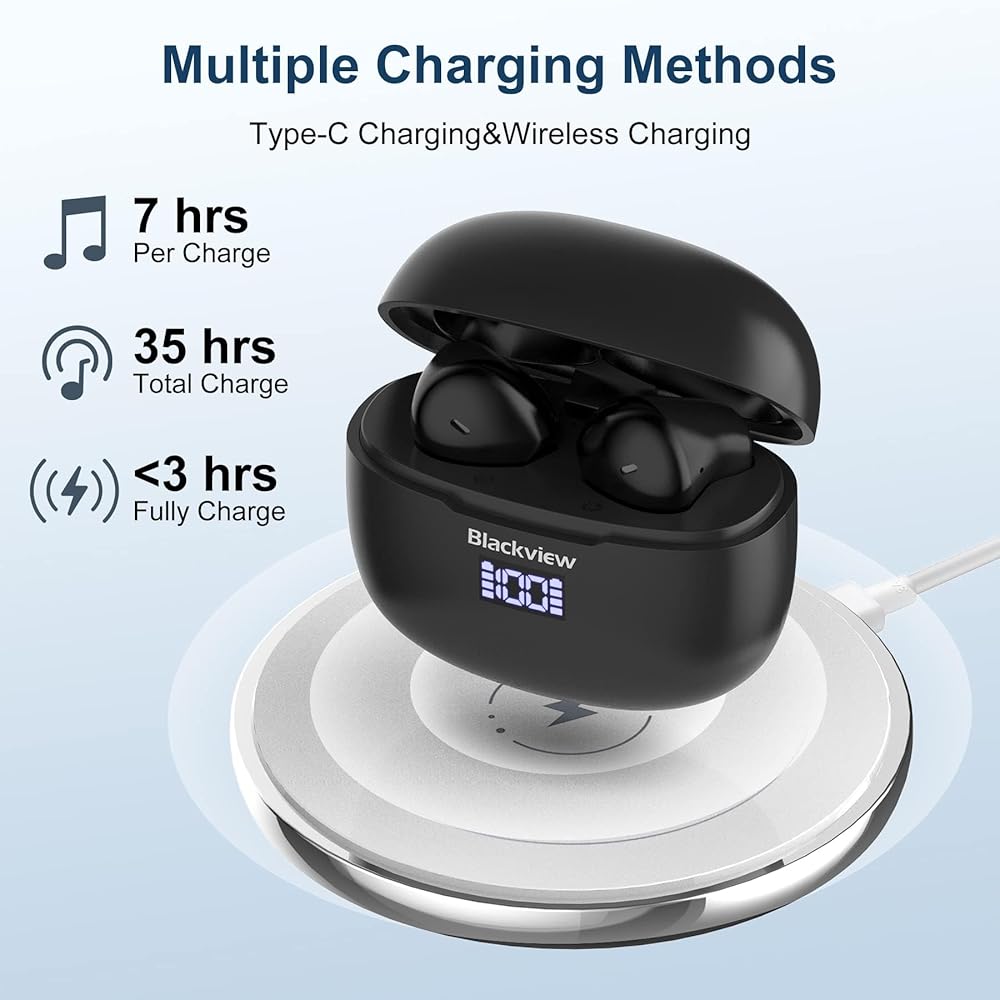 يمكن لسماعات الرأس Blackview AirBuds 7 Bluetooth أن ترضي الجميع بفضل بطارية أكبر تبلغ سعتها 470 مللي أمبير في الساعة، والتي توفر ما يصل إلى 6 ساعات من تشغيل الموسيقى بشحنة كاملة واحدة. بالإضافة إلى ذلك، ستحصل على مدة إجمالية تبلغ 30 ساعة تقريبًا مع علبة الشحن، والتي توفر وقت شحن لسماعات الرأس من 4 إلى 5 مرات. انغمس في الموسيقى. تعمل شاشة LED الذكية الموجودة في المقدمة والتي توضح مستوى بطارية العلبة أو سماعات الأذن على التخلص من قلق البطارية مرة واحدة وإلى الأبد.