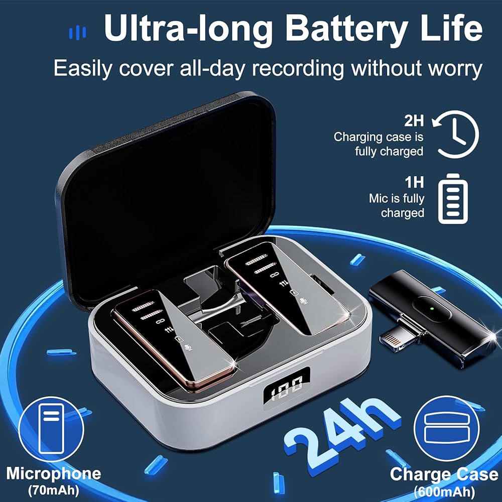 𝐃𝐔𝐀𝐋 𝐖𝐈𝐑𝐄𝐋𝐄𝐒𝐒 𝐌𝐈𝐂𝐑𝐎𝐏𝐇𝐎𝐍𝐄𝐒 𝐖𝐈𝐓𝐇 𝐂𝐇 𝐀𝐑𝐆𝐈𝐍𝐆 𝐂𝐀𝐒𝐄: علبة شحن بقدرة 600 مللي أمبير في الساعة مع شاشة LED، يمكنها إظهار طاقة البطارية في الوقت الفعلي وتوفير عمر البطارية لمدة 24 ساعة. يبلغ وزن ميكروفونات LanAqua اللاسلكية 0.32 أونصة فقط، ولن تشعر حتى بالميكروفون اللاسلكي الصغير عندما يكون متصلاً بملابسك. قم بضبط شريحة تقليل الضوضاء CVC المدمجة، وتقنية المزامنة التلقائية في الوقت الحقيقي، ونقل الإشارة 2.4G، لتحقيق المزامنة الصوتية والمرئية بسهولة.
