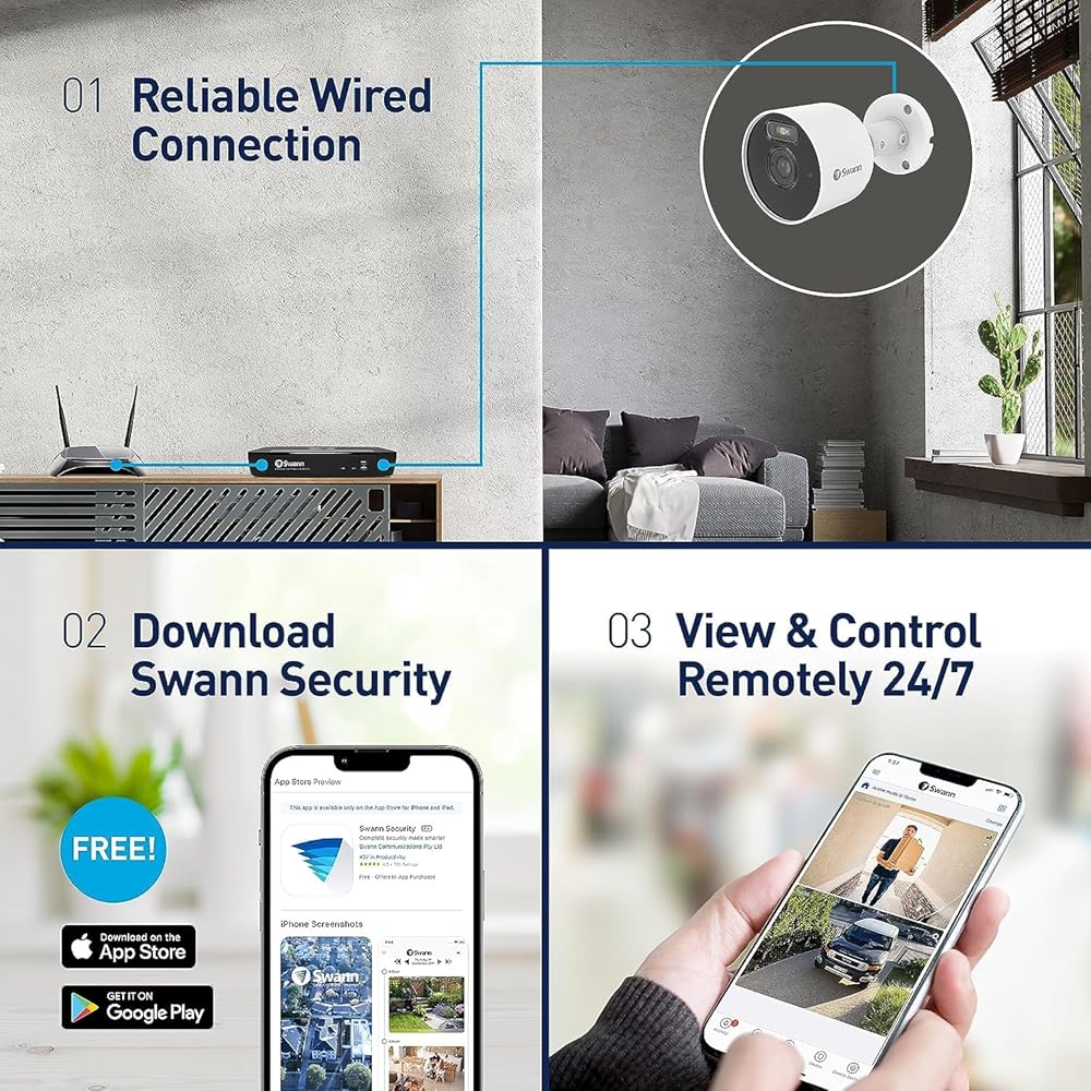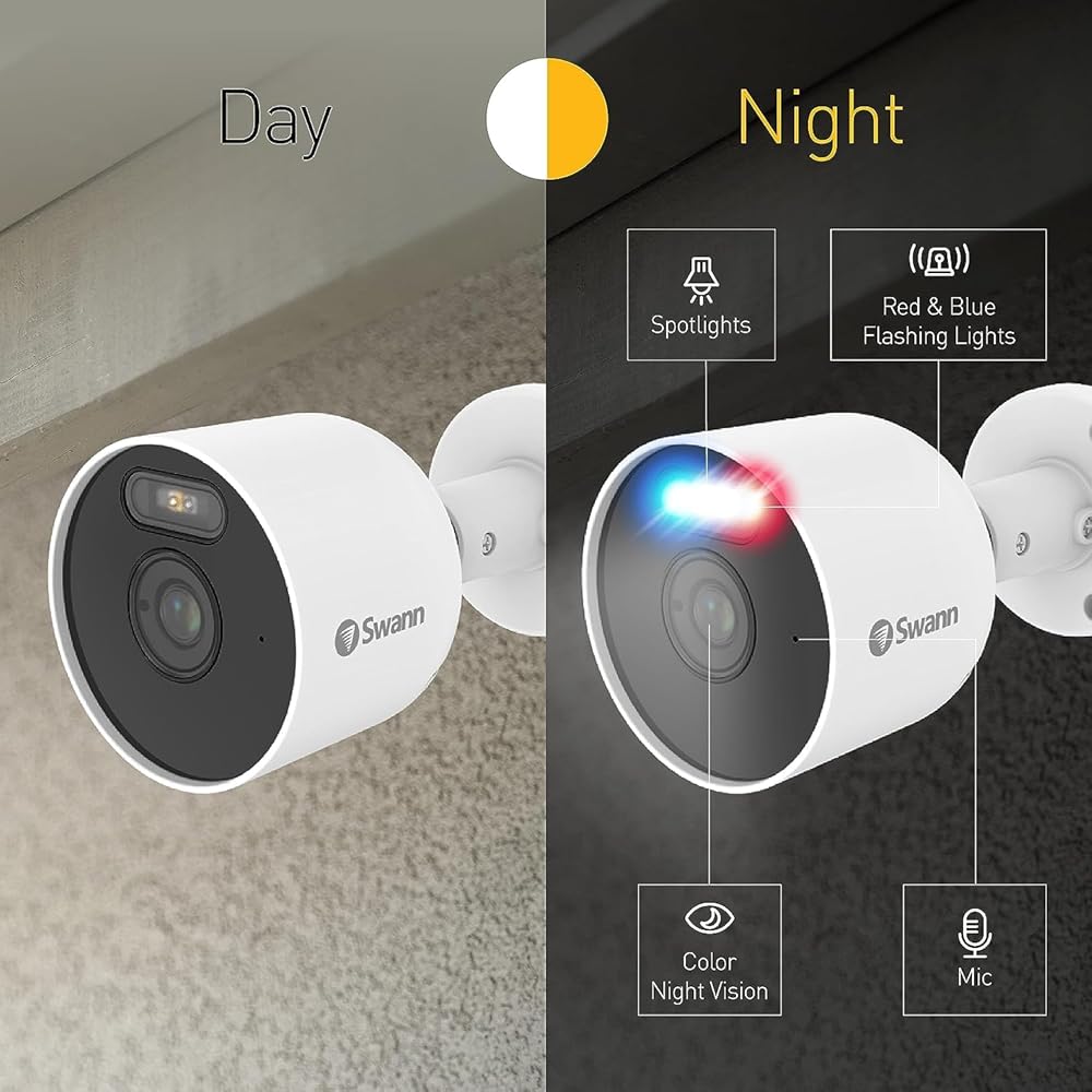 Swann's business and home security cameras come with active deterrence as a reliable way to protect what matters most to you. Equipped with spotlights that deter intruders and Night2Day color night vision that extends up to 32ft, or up to 100ft in black and white, you can have peace of mind knowing that you have a reliable wired security camera system.Stay on top of things with alerts that notify you when activity is detected, and access live streaming and stored footage on your mobile device via multi-camera monitoring that is always available. With the pre-installed hard drive, you can choose between 24/7 continuous recording or Swann True Detect heat and motion-triggered event-only recordings, giving you up to 365 days of stored video.Swann provides Do-it-Yourself CCTV camera security system and we take pride in our role in making all our communities safer. Swann's product range is designed with the goal of making the latest business and home security system solutions accessible, affordable, and user-friendly. The latest features are Hey Google and Alexa to speak to see. Swann also provides a 1-year limited warranty for protection against factory defects and technical support.Swann loves what we do because we have the vision to be the world leader in smart cameras for home security, taking care of people and making your place safe. As technology and security continue to evolve, our commitment is to always deliver smarter, faster, and the most reliable security solutions