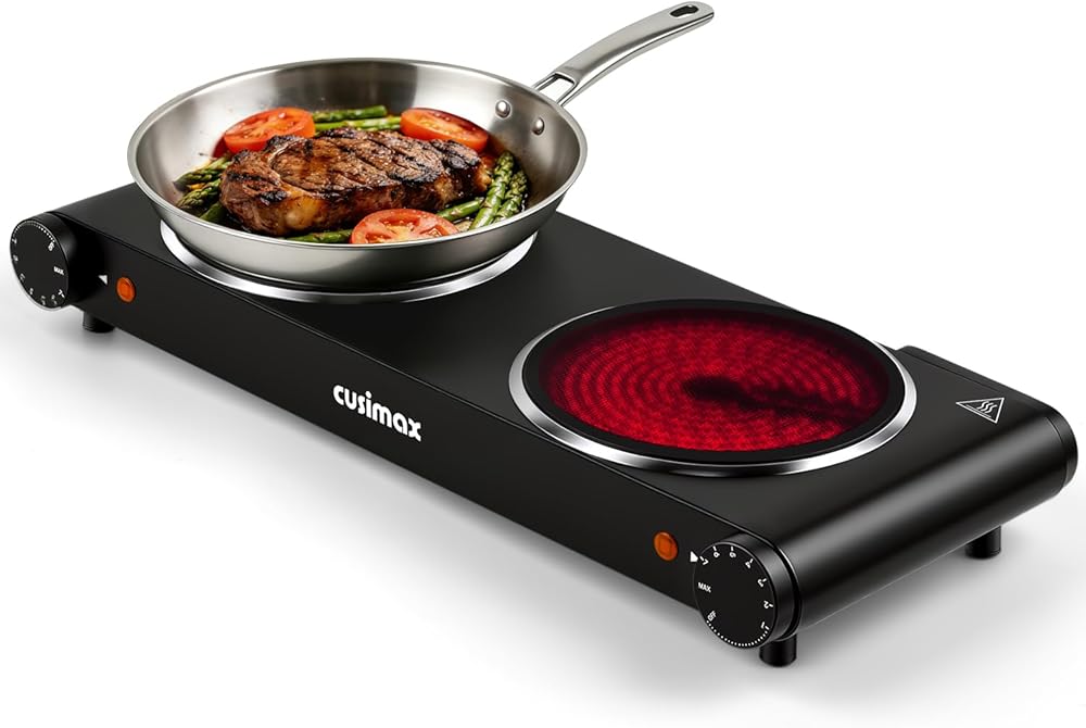 CUSIMAX موقد مزدوج، موقد كهربائي 1800 واط من السيراميك للطهي، موقد مزدوج التحكم بالأشعة تحت الحمراء، موقد كهربائي من الزجاج، نسخة مطورة من الفولاذ المقاوم للصدأ