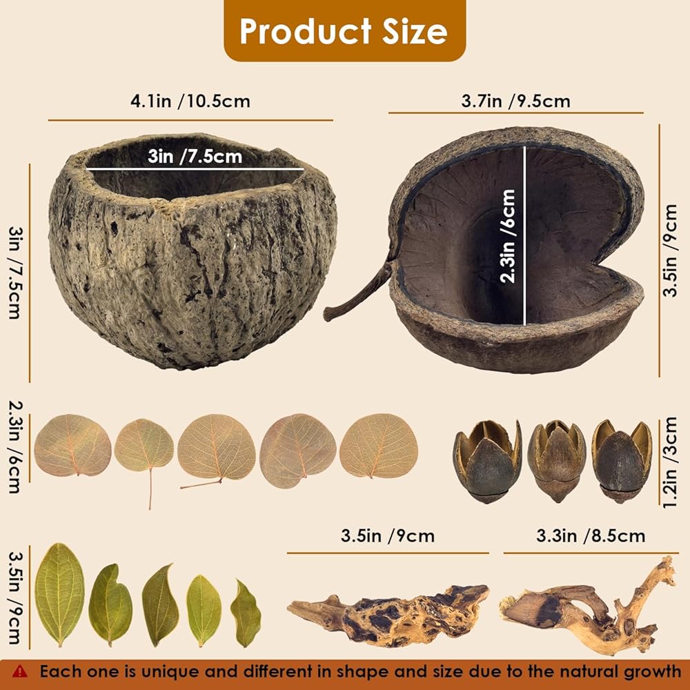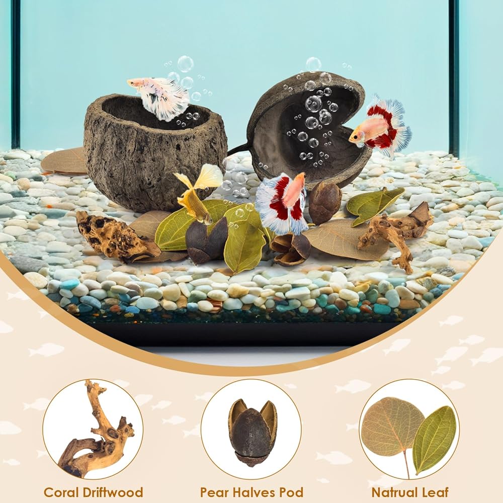 ديكورات مختلفة للخزان: عزز حوض السمك الخاص بك مع ديكورات الخزان هذه، التي تتميز بكهف قشرة جوز الهند الطبيعي، ووعاء تربية قشرة جوز الهند، وأوراق الشجر، وأنصاف الكمثرى، وزخارف من الخشب الطري.