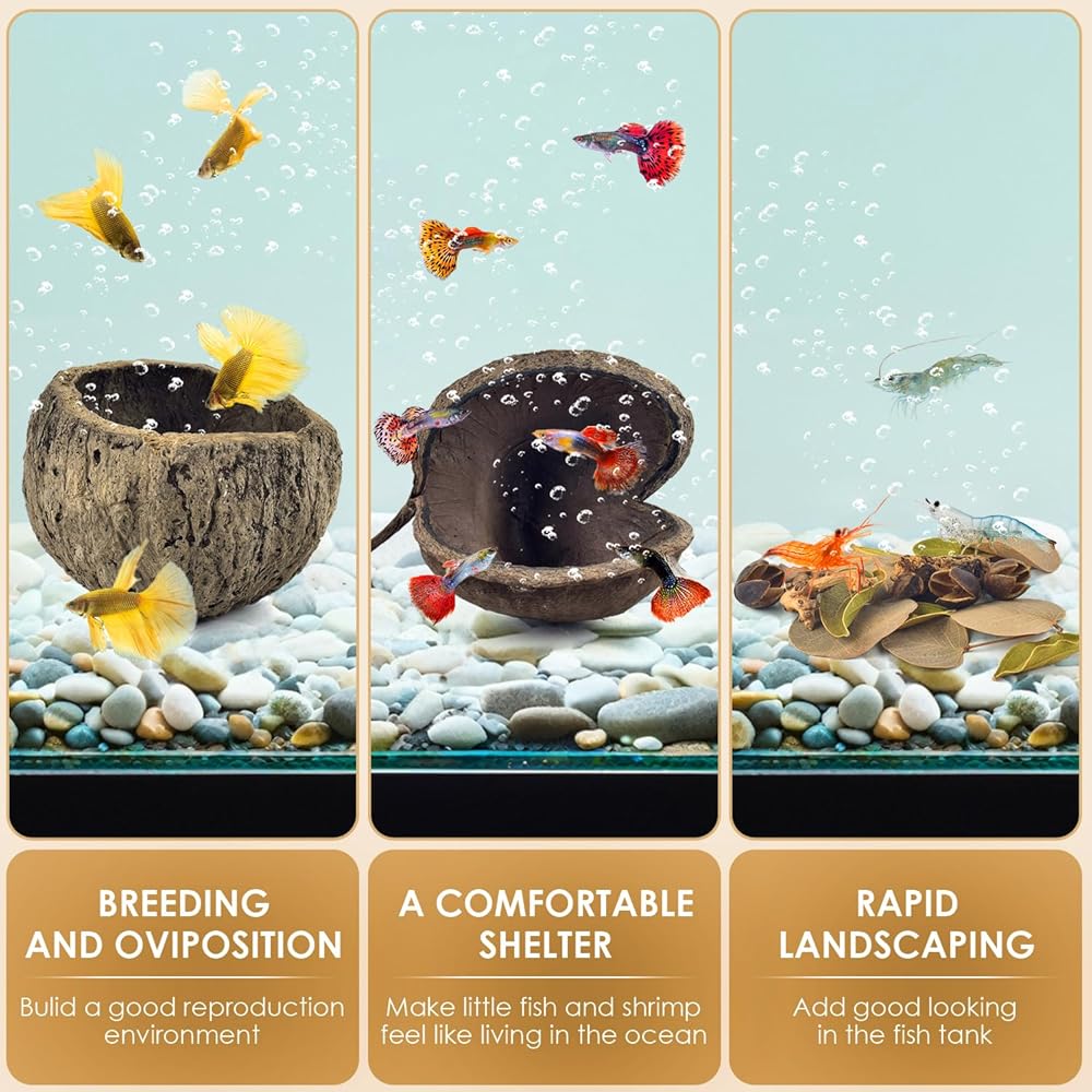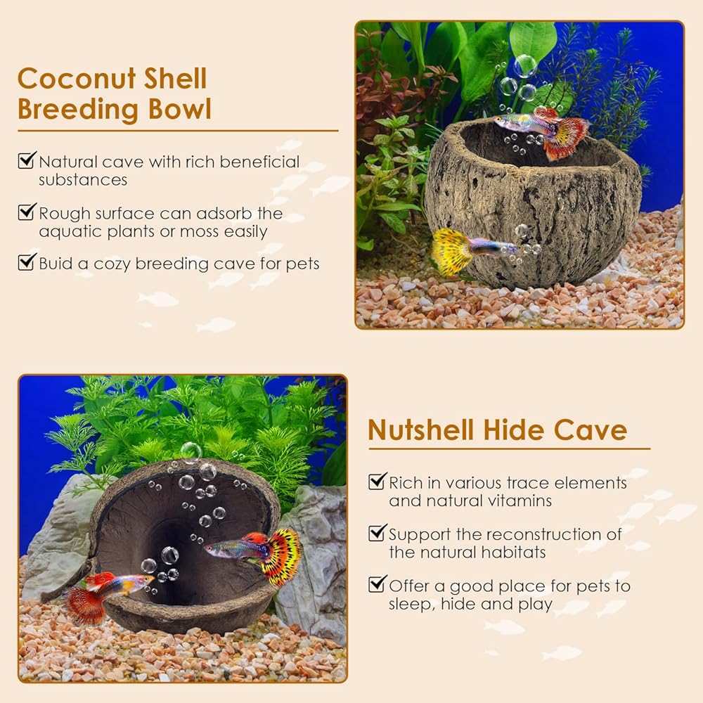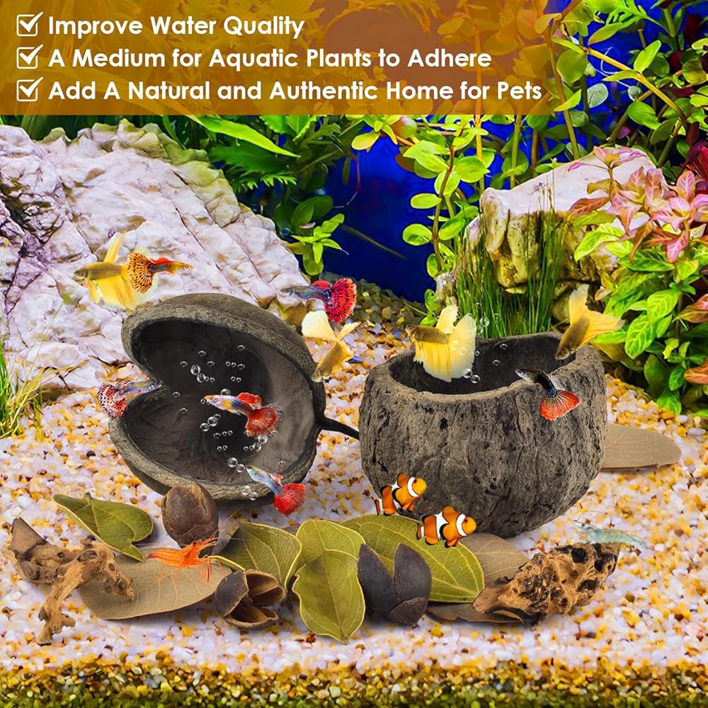 الاختباء والتكاثر: توفر كهوف قشرة الجوز الطبيعية أماكن للاختباء ومناطق للتكاثر، بينما تخلق الأخشاب الطافية والأوراق منظرًا طبيعيًا تحت الماء. توفير بيئة مريحة وجذابة لحيواناتك الأليفة المائية للتكاثر واللعب والراحة.