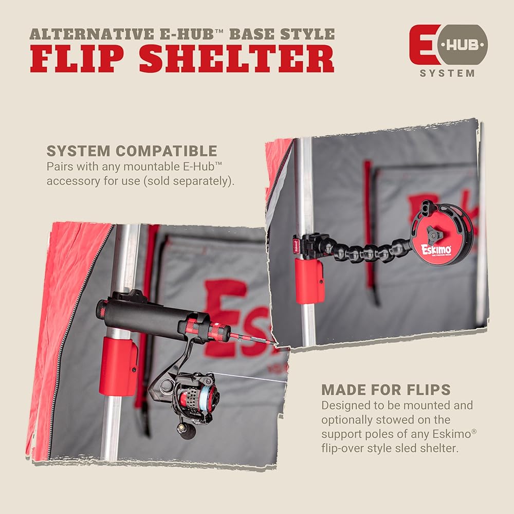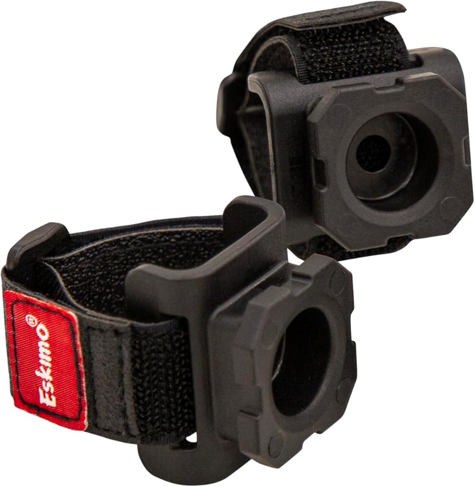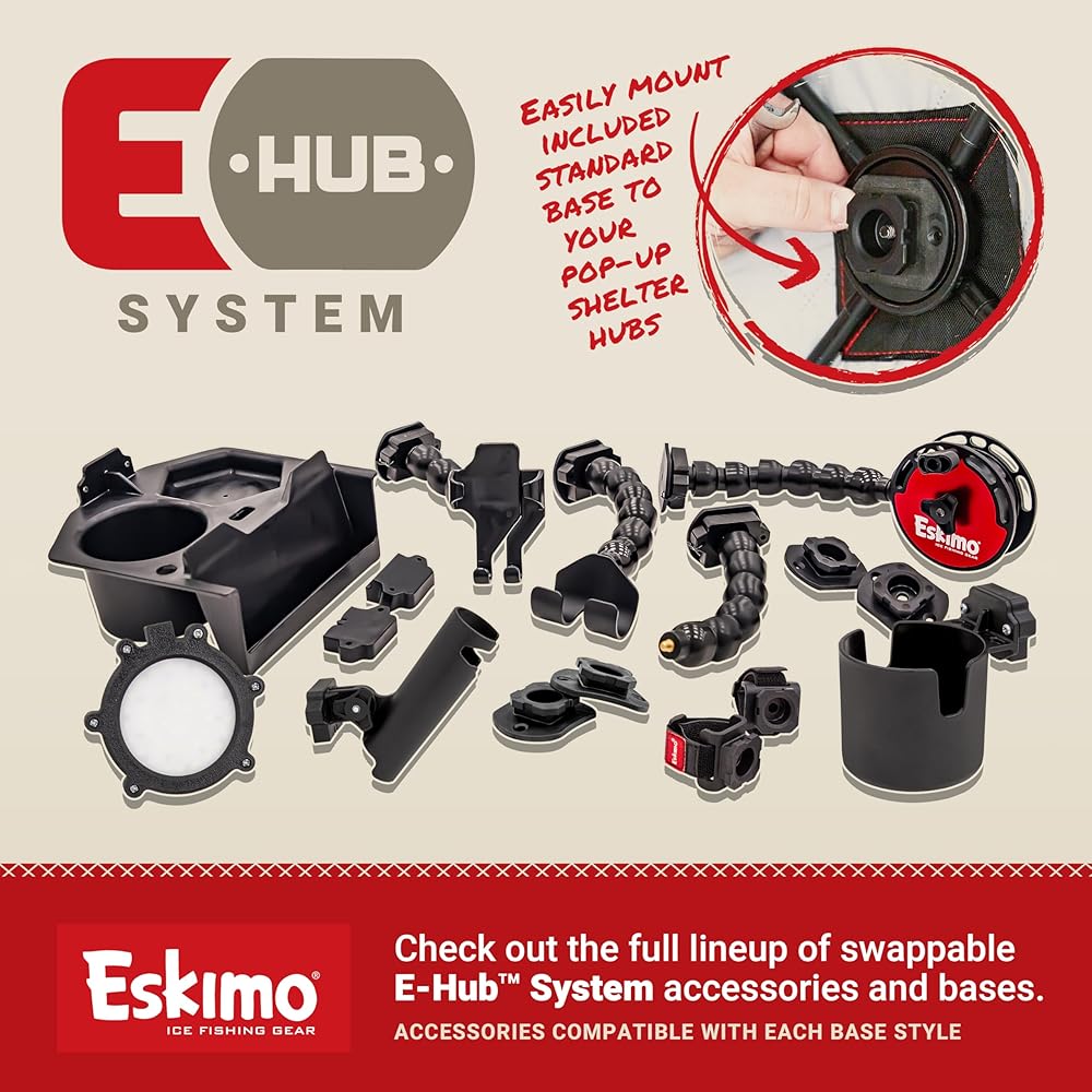Strap an E-Hub base to the support poles in your shelter to firmly secure any E-Hub accessory. Universally fits the support bars of all Eskimo flip-over style shelters. The locking clip on the base plate allows for mounting at any angle, without fear of bumping them out of place.