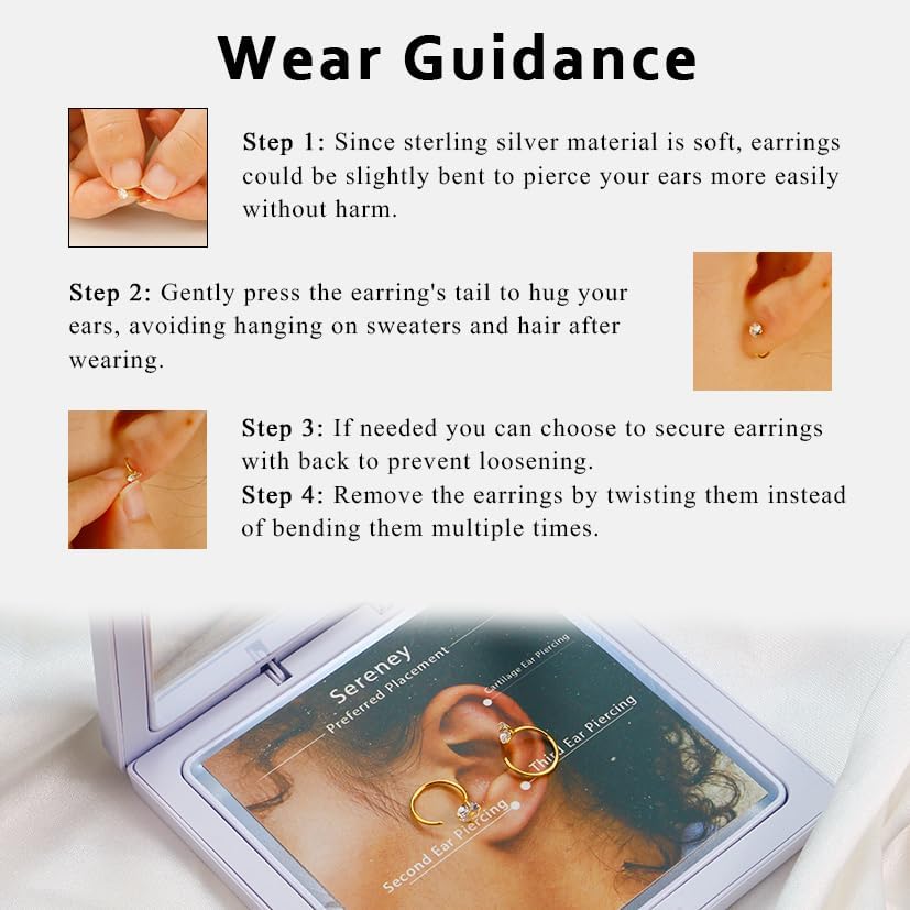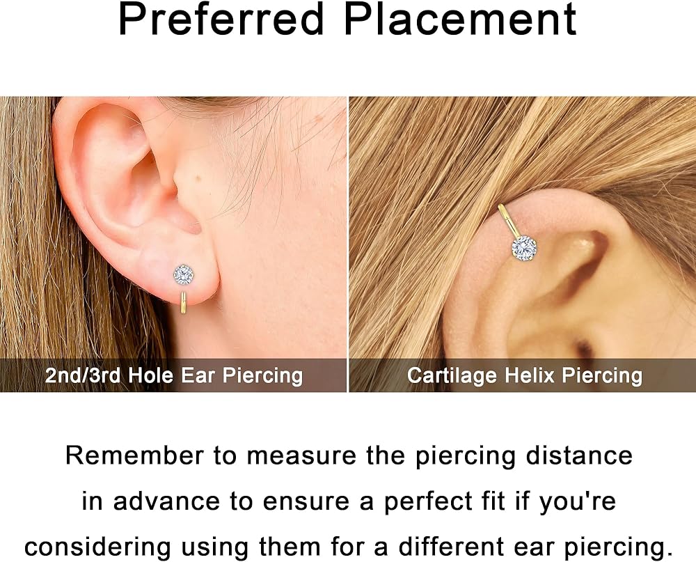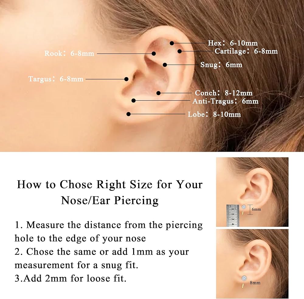 أقراط دائرية صغيرة: هذه الأقراط البسيطة لها قطر داخلي 8 مم، ومقياس 20، مثالية لثقب الأذن الثاني والثالث، وثقب الغضروف، وحتى ثقب الحلزون. يمكنك ارتدائها منفردة أو تكديسها مع أقراط أخرى لإضفاء مظهر متعدد الطبقات وأنيق. تذكري قياس مسافة الثقب مسبقًا لضمان التوافق التام إذا كنتِ تفكرين في استخدامها لثقب أذن مختلف.