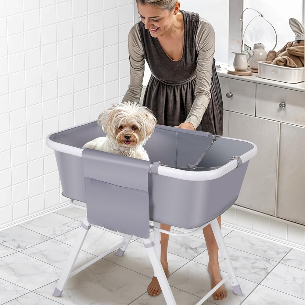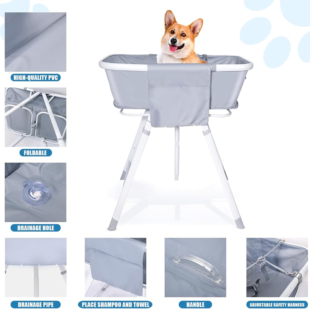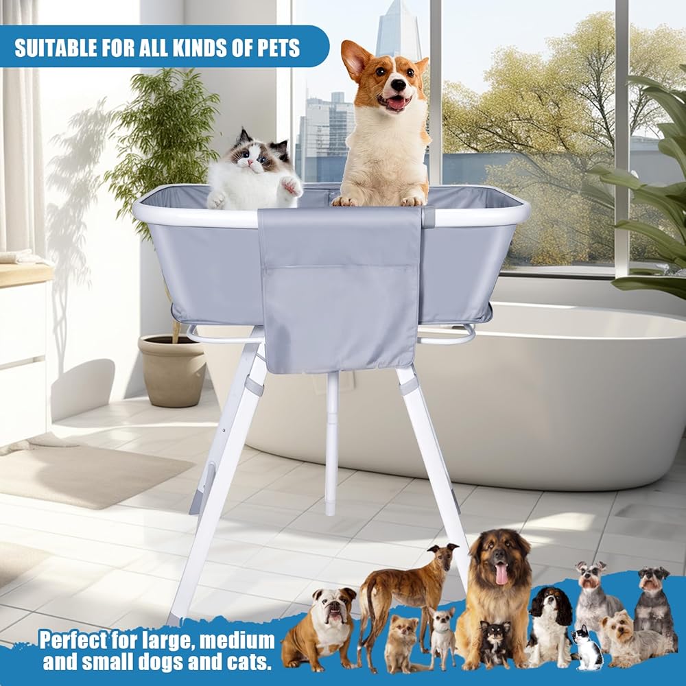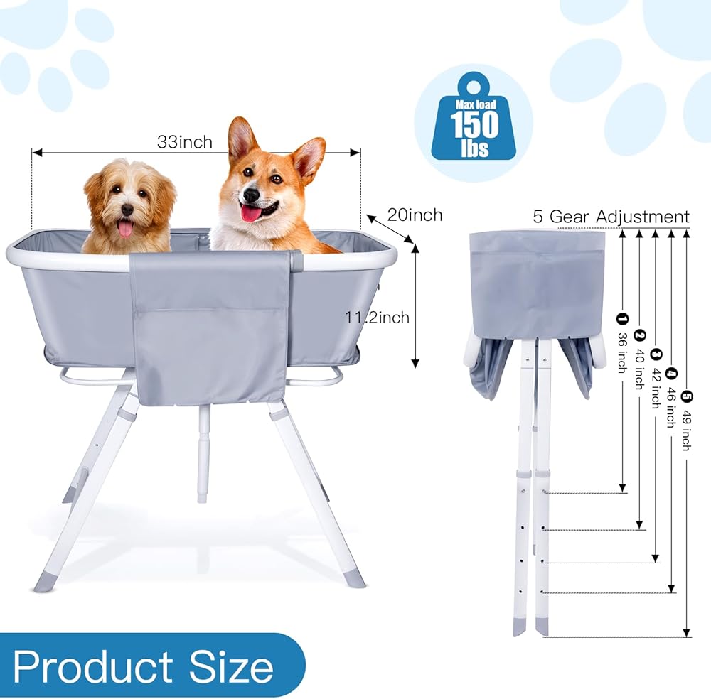 حوض استحمام محمول للكلاب، حوض استحمام للكلاب، محطة استحمام لغسيل الحيوانات الأليفة مع قفل أمان وجيب جانبي للقطط الصغيرة والمتوسطة والكبيرة، للاستخدام الداخلي والخارجي، ارتفاع قابل للتعديل بخمسة مستويات، قابل للطي، رمادي