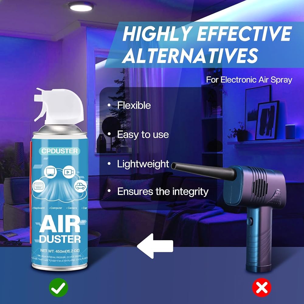 EXCELLENT CLEANING: CPDUSTER keyboard cleaner air spray remove hard-to-reach dust and debris from electronic devices or cars. Compared to electric computer air duster spray, air duster for pc clean more quickly, more carefully and are easier to use.