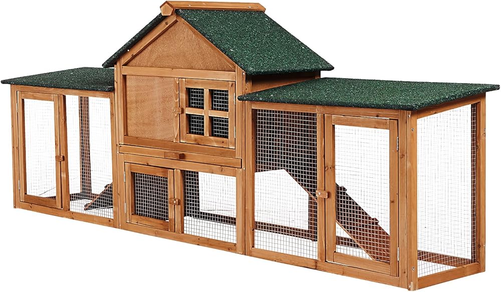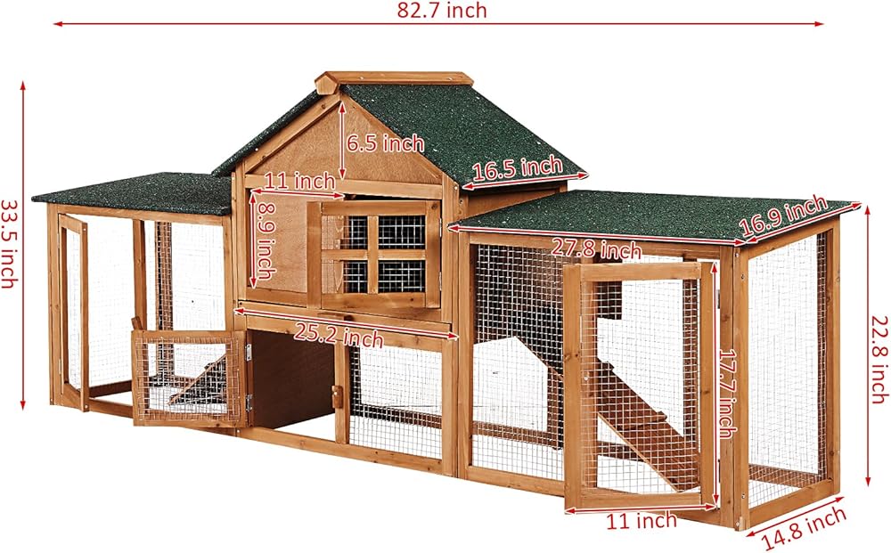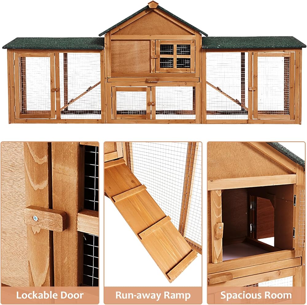 【مريحة للدواجن】مع المنزل الرئيسي والجوانب المزدوجة لقفص الأرانب في الداخل توفر للأرنب مساحة خاصة به للعب والعيش فيها، مما يمنح أرنبك بيت الدواجن. مساحة نشاط قفص الأرانب مع بابين مفتوحين مما يسهل على حيوانك الأليف الدخول والخروج. كما يساعدك التصميم متعدد الأبواب على التفاعل مع حيوانك الأليف وتنظيف القفص بشكل أسهل.