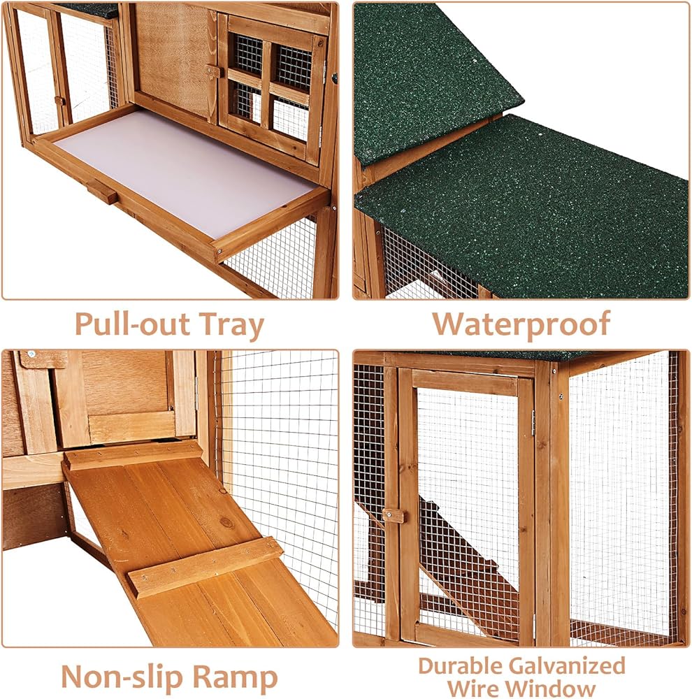 【سهولة التنظيف والتهوية الجيدة】يحتوي قفص الأرانب في الهواء الطلق على صينية قابلة للإزالة تسهل عليك تنظيف أقفاص الأرانب، وسيمنح القفص الأنظف حيوانك الأليف تجربة أكثر راحة للعيش فيه. قفص أرنب داخلي مع سياج من الأسلاك المجلفنة للحماية دواجنك من الحيوانات المفترسة الخارجية مع ضمان التهوية الجيدة.
