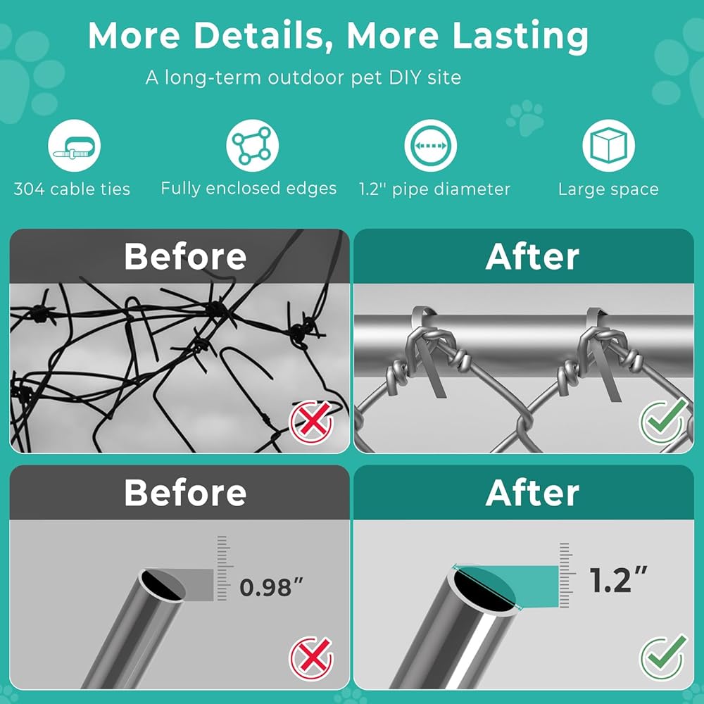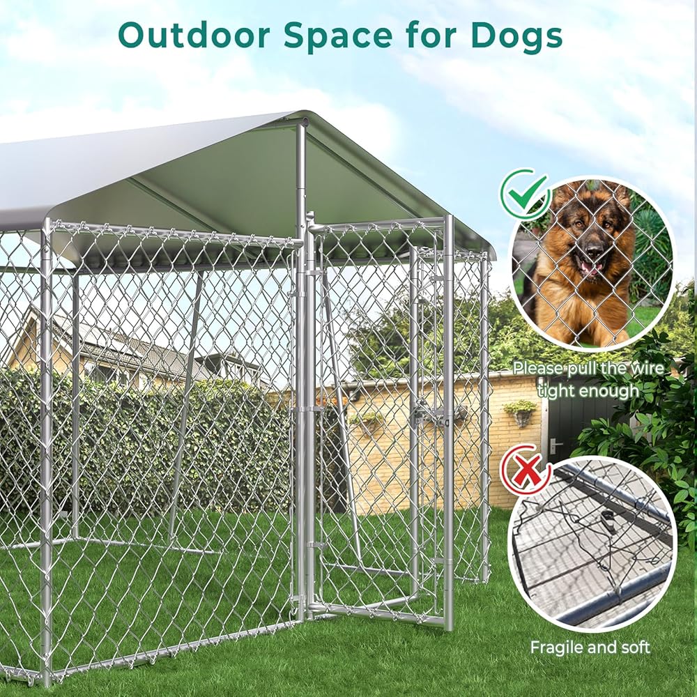 【Enhanced Durability】Our large outdoor dog kennels features a 2.5mm iron mesh with stainless steel ties, and reinforced edge wrapping to prevent loosening or bending