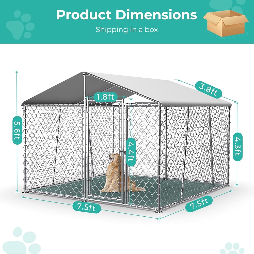 7.5 × 7.5 قدم بيت الكلب الخارجي الكبير، بيت الكلب في الهواء الطلق سلسلة ربط روضة الكلاب الكلاب تشغيل بيت الكلب الحيوانات الأليفة السياج الصلب مع قفل وغطاء مقاوم للماء للفناء الخلفي