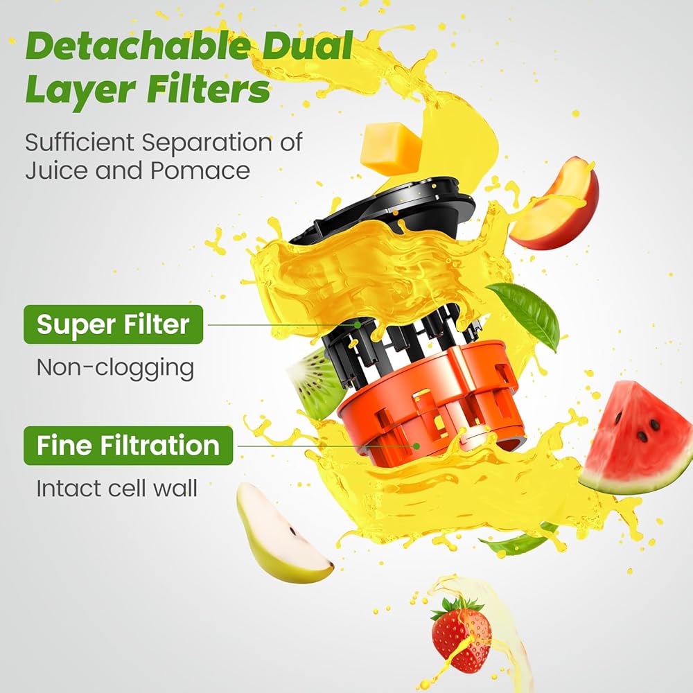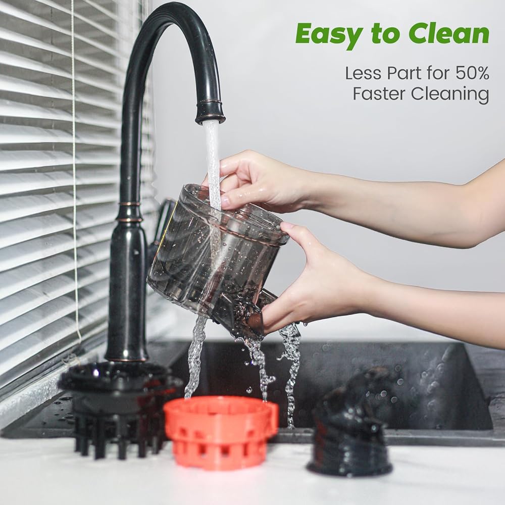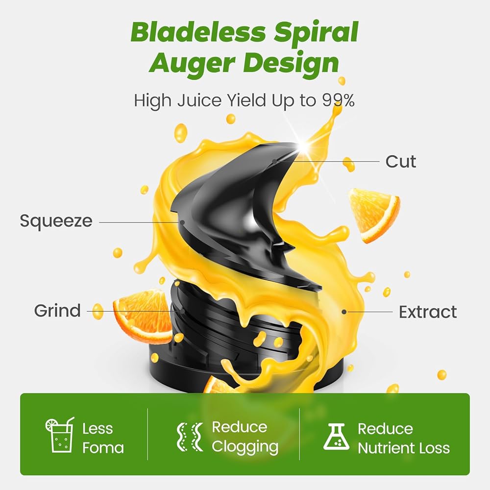 عصارة بالضغط البارد، آلات مضغ بطيئة مع قناة تغذية كبيرة جدًا تناسب الفواكه والخضروات الكاملة، سهلة التنظيف، تغذية ذاتية دون جهد لعصير الدفعات، إنتاجية عالية للعصير، خالية من مادة BPA، أسود