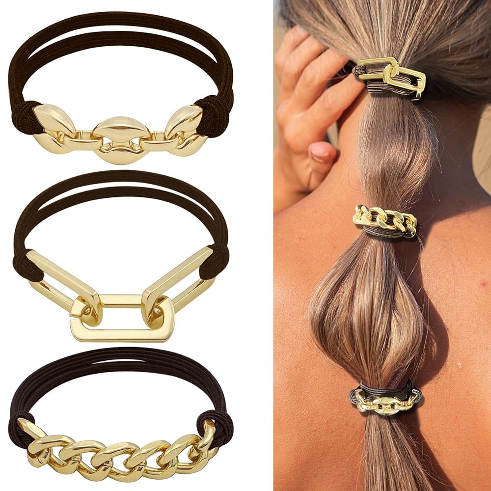 • ربطات شعر لطيفة تأتي بثلاثة ألوان: الكاكي، والكراميل، والبني الداكن. وثلاثة أنماط: وصلة سلسلة الأنف الخنزير، وصلة سلسلة مشبك الورق، ووصلة السلسلة الكوبية.