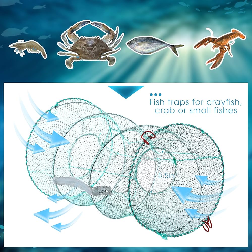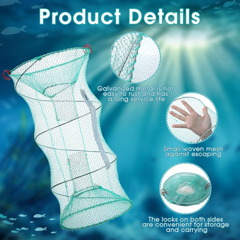 اختيار مواد عالية الجودة: سلة مصيدة الصيد مصنوعة من شبكة نايلون مزدوجة الطبقات وسلك مطلي بالزنك، متينة وصلبة، موثوقة وخفيفة الوزن، شبكة جيدة ومستقرة في الهيكل، قوية بما يكفي ضد الكسر والتمزق والتآكل والالتواء