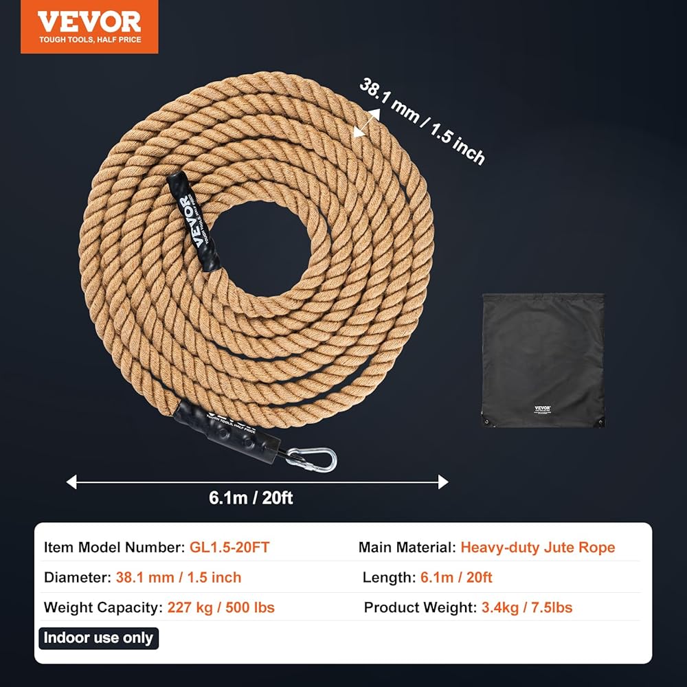 • مقاومة التآكل وقوة الشد العالية: مصنوع من مادة حبل القنب عالية التحمل بقطر يصل إلى 1.5 سم، يوفر حبل التسلق في صالة الألعاب الرياضية هذا قوة شد قوية ومقاومة للتآكل، وقادر على تحمل وزن وتوتر كبيرين. لقد خضع لاختبار قوة الشد 15000 نيوتن ويدعم وزنًا يصل إلى 500 رطل كحد أقصى. يوصى باستخدامه في الأماكن المغلقة في البيئات الجافة، مع تجنب ملامسة الرطوبة والماء.