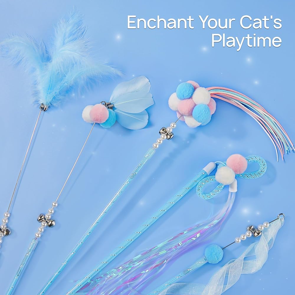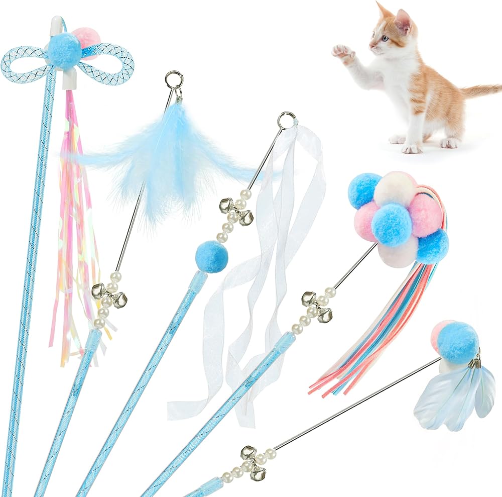 مجموعة عصا الجنية التفاعلية: مجموعة عصا القطط هذه المكونة من 5 قطع مثالية للقطط الصغيرة والقطط البالغة، وتتميز بالريش والأجراس والأشرطة التي تعزز المرح والمشاركة. تعتبر ضرورية للعب في الأماكن المغلقة، فهي تحافظ على تحفيز قطتك ونشاطها، مما يجعلها وسيلة مثالية للتخلص من الملل لقطتك المرحة.