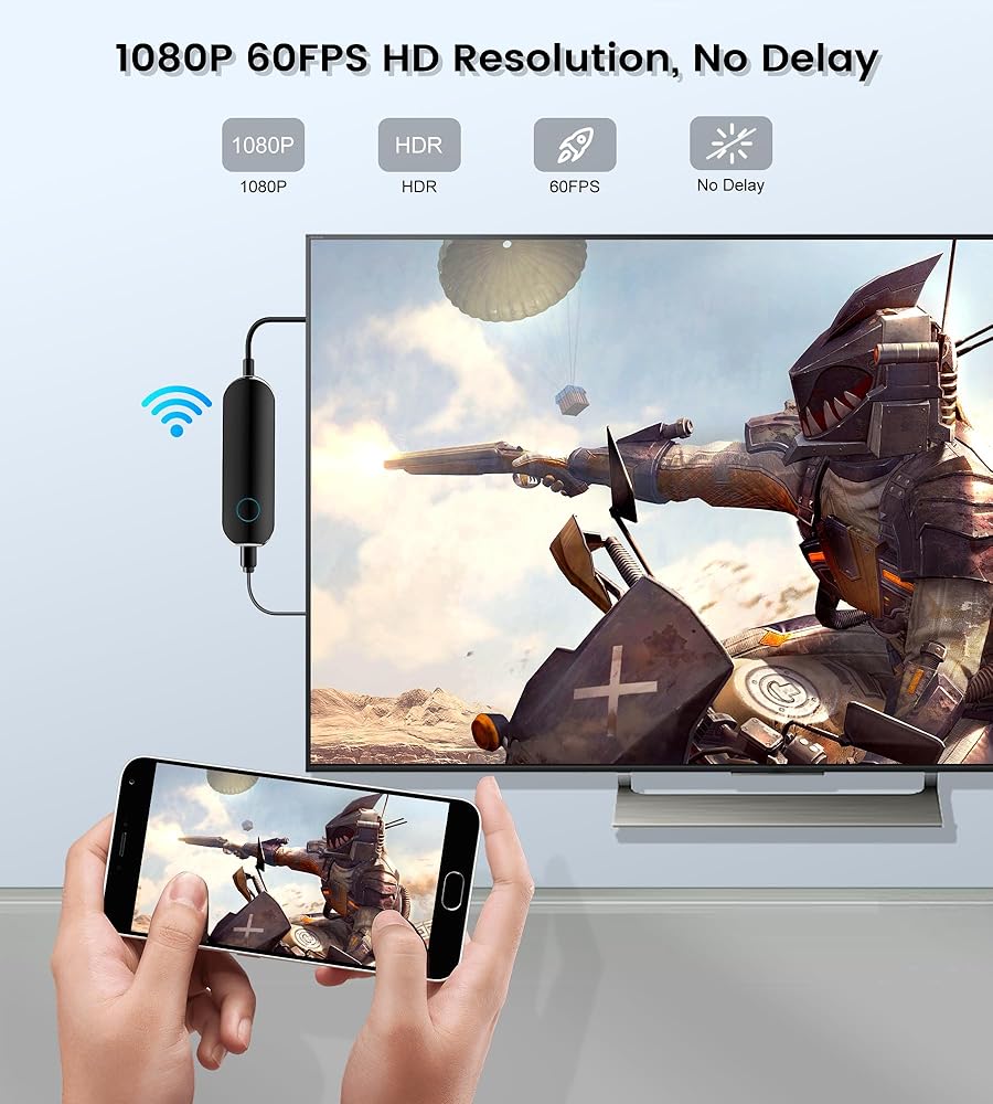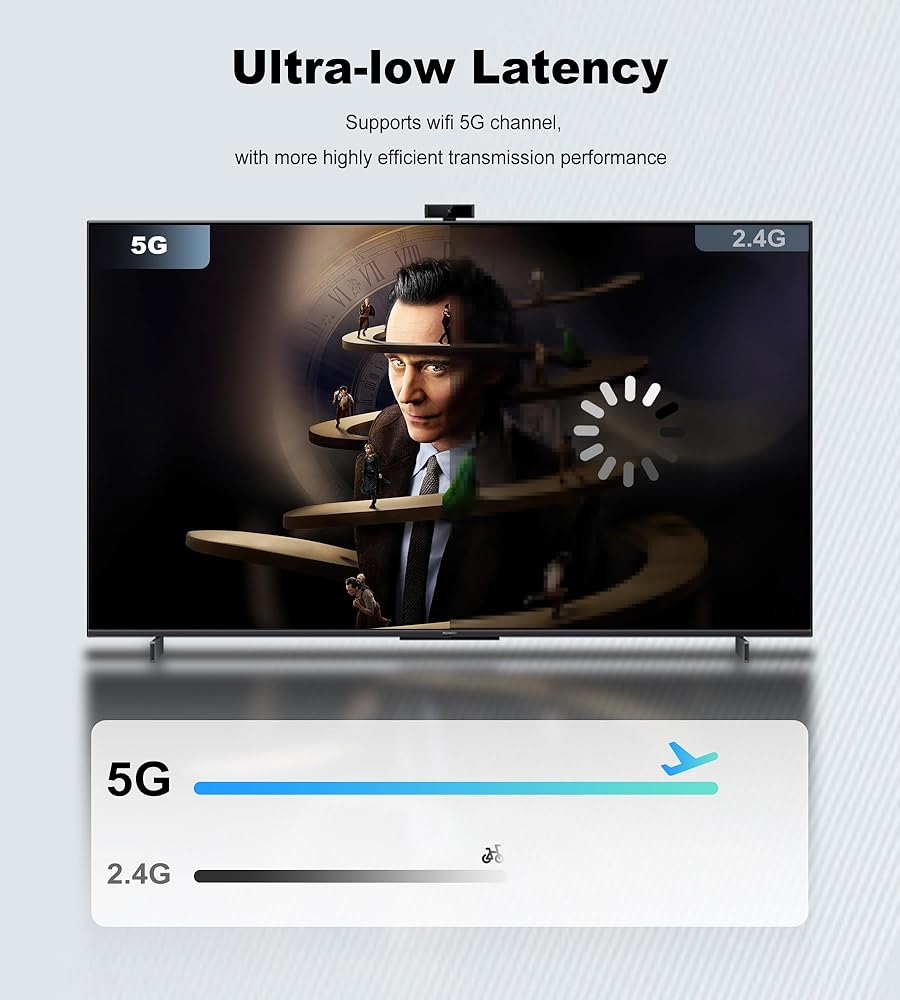 شاشة HDMI لاسلكية عالية الجودة: شريحة مدمجة عالية الأداء تضمن نقل الإشارة في الوقت الحقيقي بدون زمن استجابة وبدون تأخير. لا يوجد أي عائق للاستخدام في نطاق 10 أمتار، فهو مناسب للترفيه المنزلي واجتماعات العمل ومشاركة الحفلات والفيديو عبر الإنترنت والسيناريوهات الأخرى.