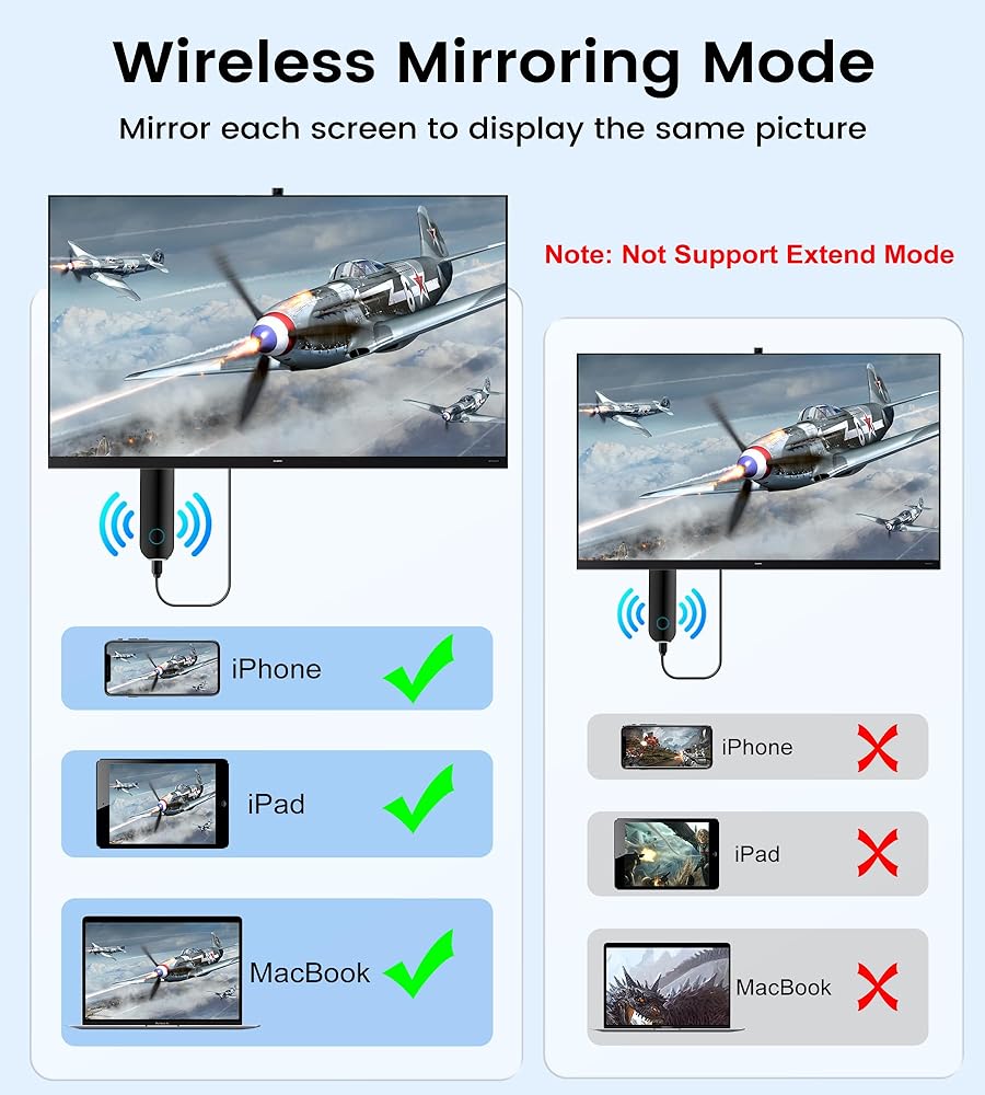 توافق واسع: يعمل دونجل محول العرض HDMI اللاسلكي الخاص بنا مع نظام iOS، ونظام Mac OS، من iPhone/iPad/MacBook إلى جميع أجهزة التلفاز/جهاز العرض/الشاشة المزودة بمنفذ HDMI (ملاحظة: يدعم iOS 9 أو أعلى) يرجى ملاحظة: لا تدعم مع بعض التطبيقات المدفوعة المشتركة والتي تتمتع بحماية حقوق الطبع والنشر للفيديو "HDCP". مثل Netflix، وAmazon prime videos، وHulu، وComcast tv، وXfinity، وVudu، وSky Go، وBT Sport، وما إلى ذلك.