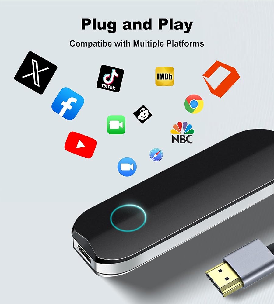 التوصيل والتشغيل: لا يوجد تطبيق، اتصال بسيط للحصول على راحة البث اللاسلكي مع الإعداد السهل. لا حاجة لتطبيقات أو برامج تشغيل أو برامج، بنقرة واحدة لعكس شاشة هاتفك أو الكمبيوتر المحمول على الشاشة الكبيرة. 🔥نصائح: جهاز البث اللاسلكي هذا غير قادر على فك تشفير محتوى البث المتميز. تشمل المنصات المعنية Verizon FI0S وDl-sney+ وT-L-C وpeac0ck وhis0ry وAmazon pr-im-e Video.