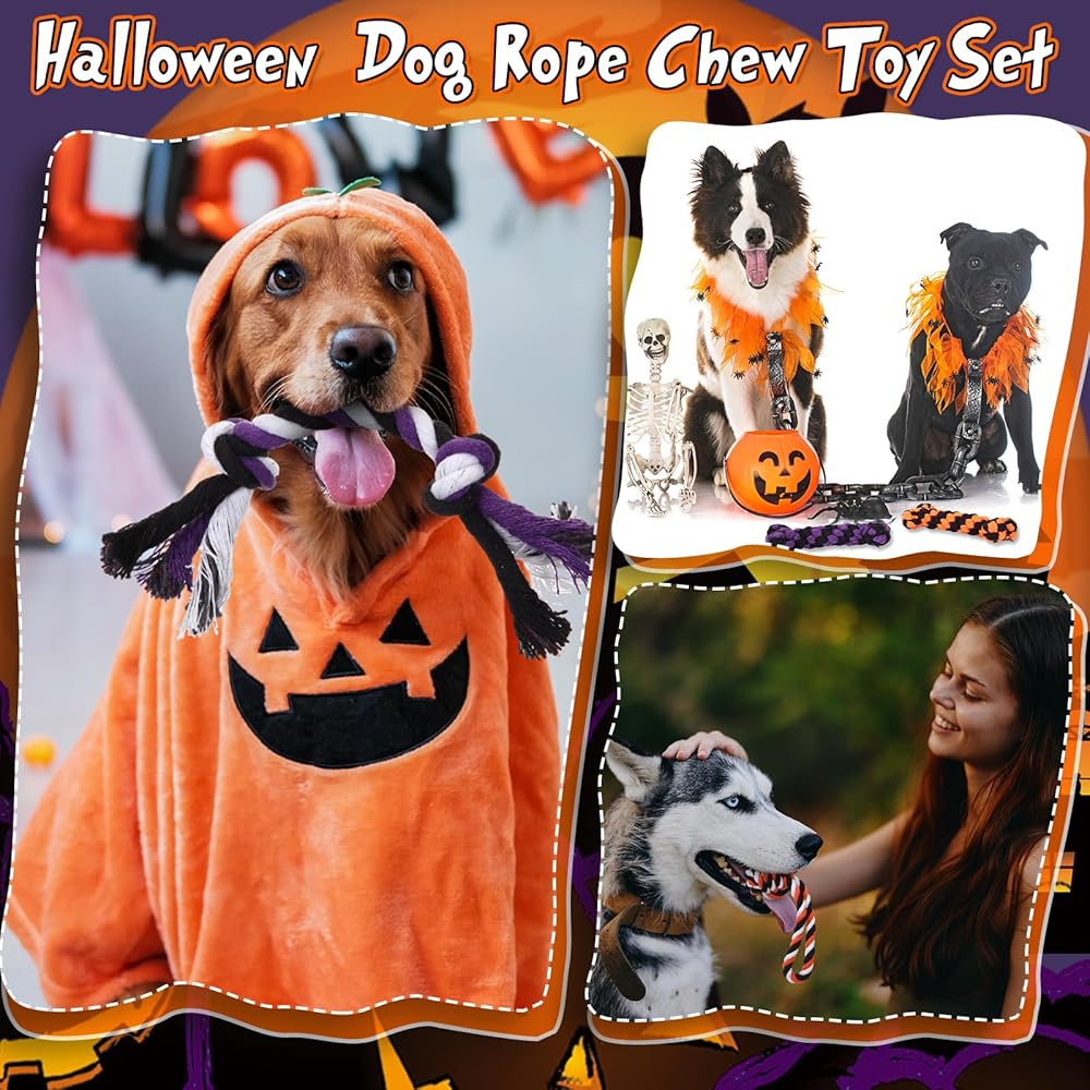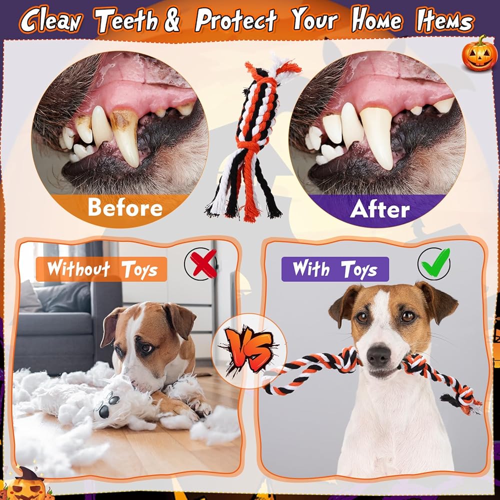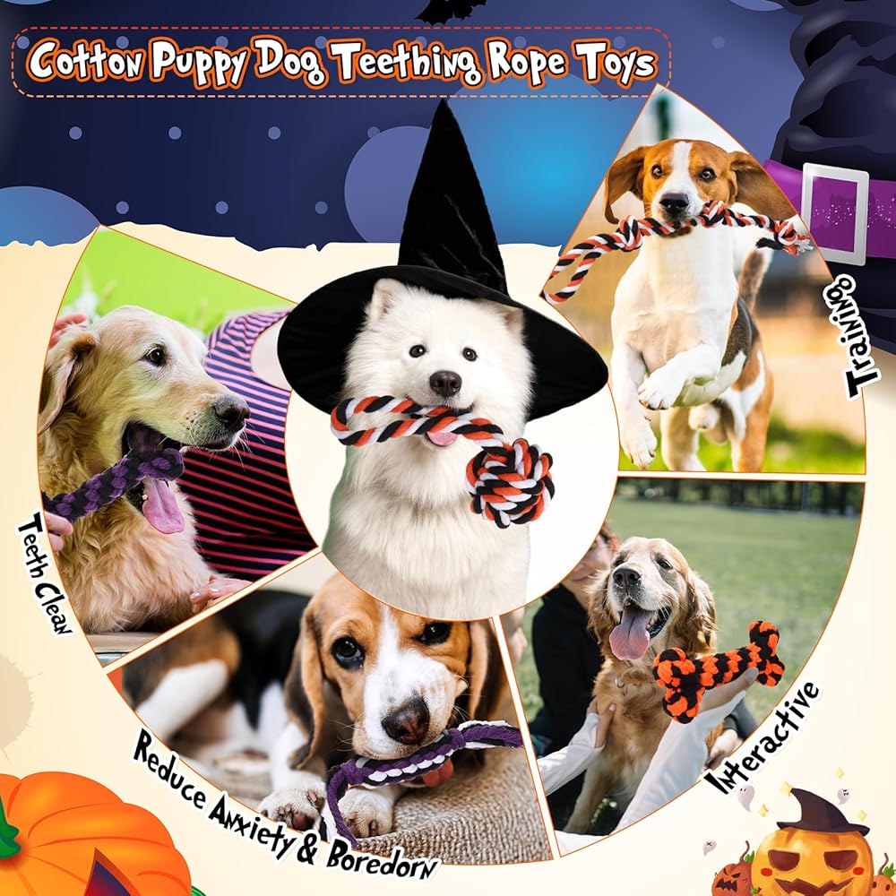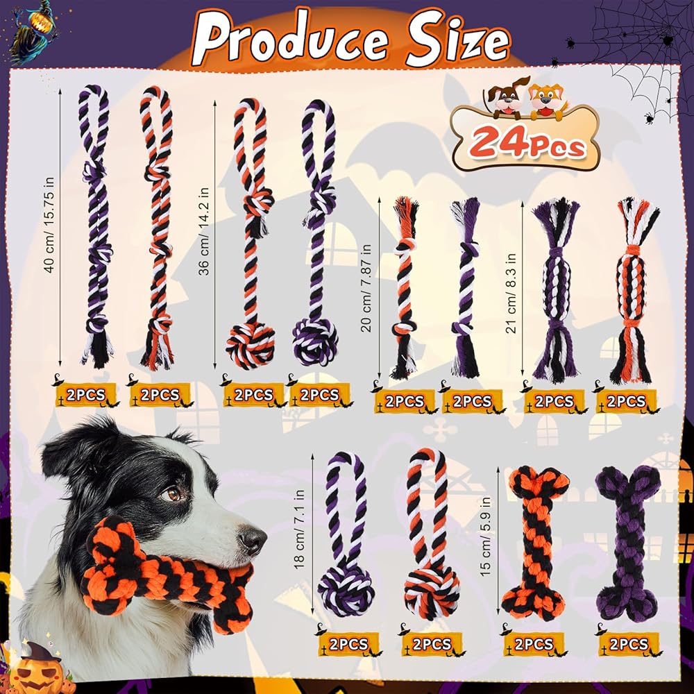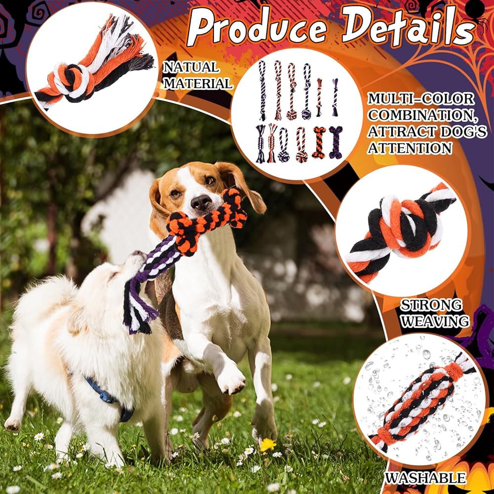 • Materials: this Halloween bulk dog toy is made of cotton rope, designed to be tear-resistant; Not easy to break; The tight braiding and sturdy knots make it ideal for dogs to chew without causing harm to their teeth or gums; Protecting their teeth when chewing ensures that your beloved dog enjoys long-lasting fun