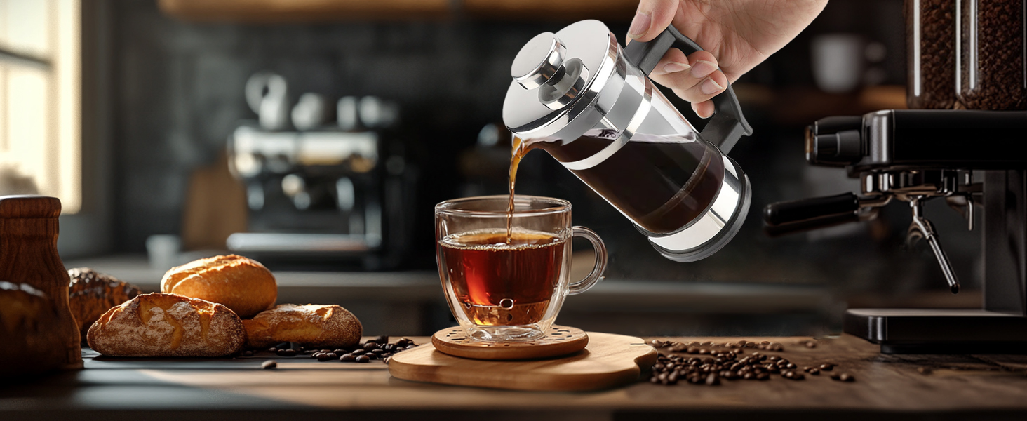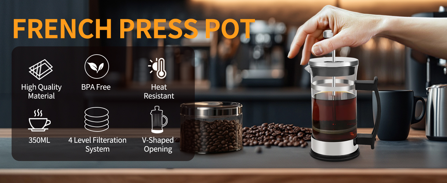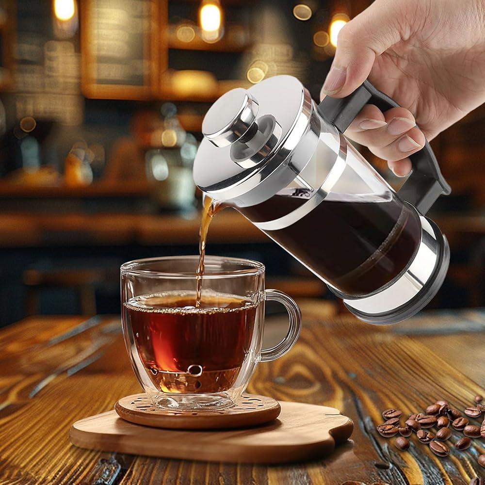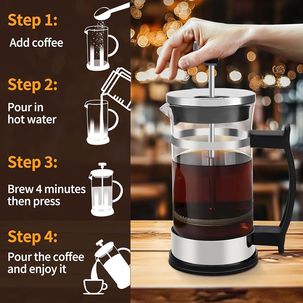 سهلة الاستخدام: تتيح لك المكابس الفرنسية الزجاجية صنع قهوتك الخاصة في أربع خطوات فقط: أضف مسحوق القهوة المطحون بشكل خشن، وأضف الماء الساخن وحركه، وانتظر بضع دقائق، ثم اضغط واستمتع بفنجان من القهوة ذات النكهة الفريدة.