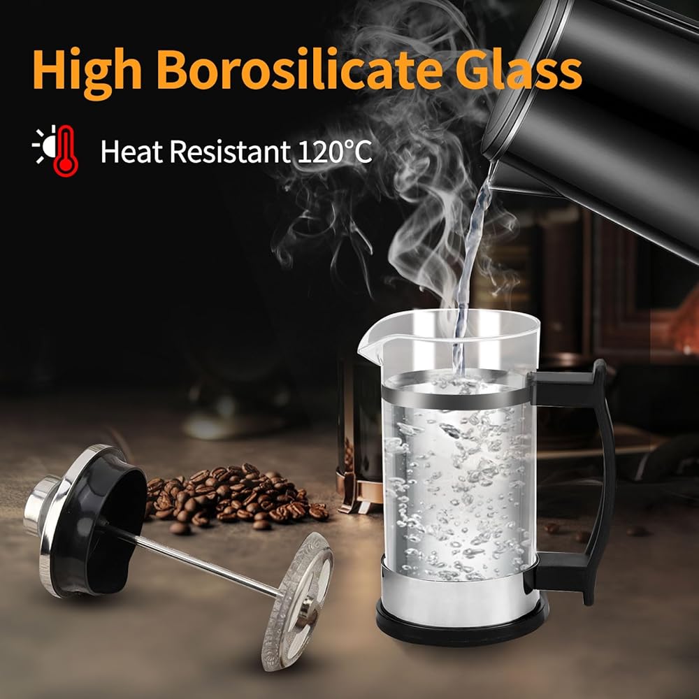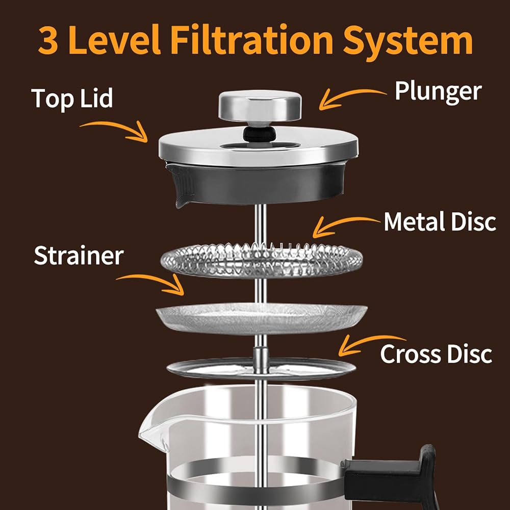 ترشيح مزدوج: تعتمد ماكينة الضغط الفرنسية على تقنية ترشيح مزدوجة، والتي تعمل على تعزيز الترشيح بشكل فعال بنسبة 50% ويمكنها تصفية المزيد من بقايا القهوة، حتى تتمكن من الاستمتاع بالطعم السلس والنكهة الغنية للقهوة.