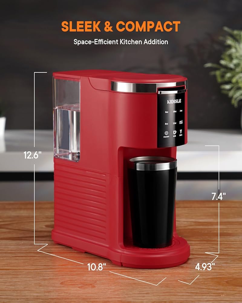 ماكينة صنع القهوة الفردية، ماكينة صنع القهوة 3 في 1 لكبسولات K والقهوة المطحونة والشاي، أحجام مشروبات 6 إلى 14 أونصة، مع خزان مياه قابل للإزالة 40 أونصة، إعدادات إزالة الترسبات، أحمر