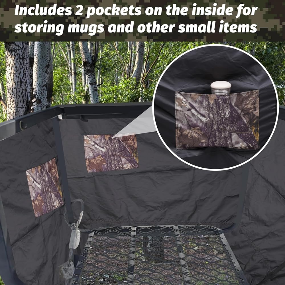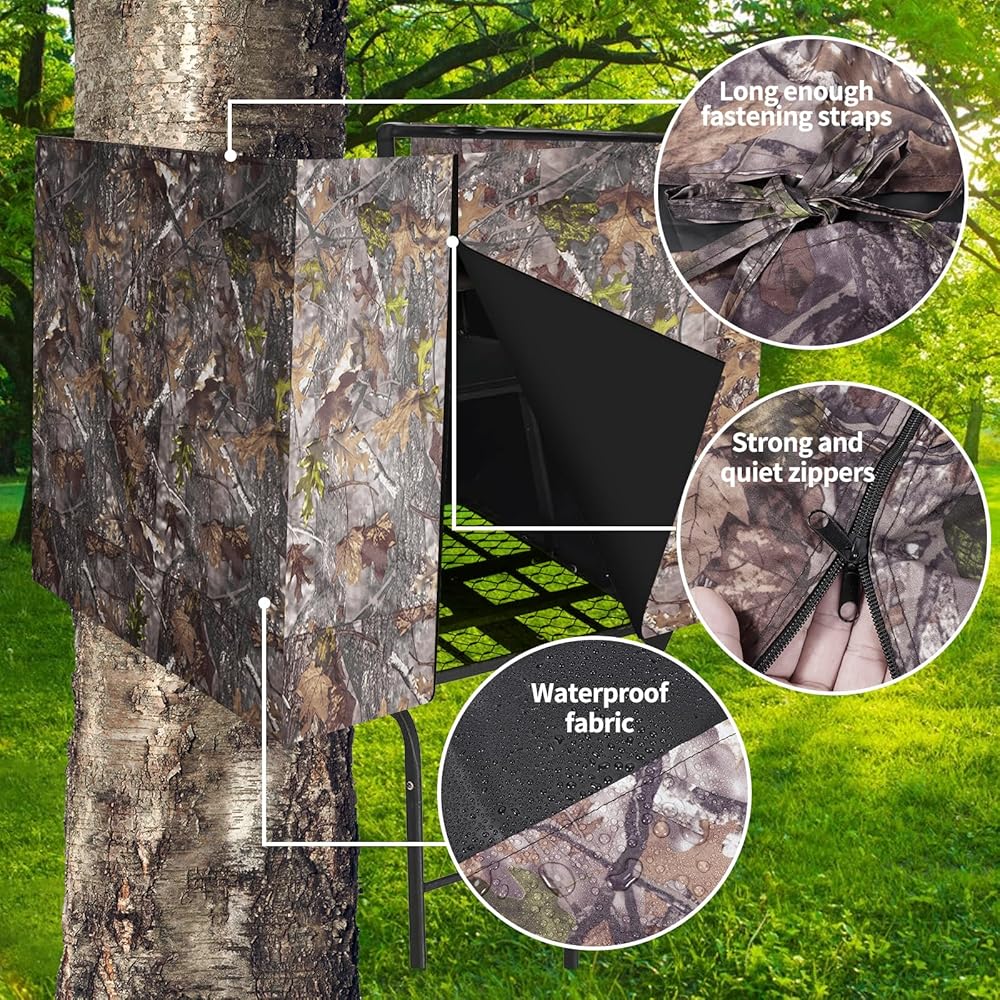 تركيب متعدد الاستخدامات: سواء كنت تفضل حاملًا مرتفعًا أو ستارة قائمة بذاتها على الأرض، فإن ستارة حامل الشجرة هذه سهلة التركيب لتلبية احتياجات الصيد الخاصة بك وتناسب معظم حوامل السلم الفردية أو المزدوجة