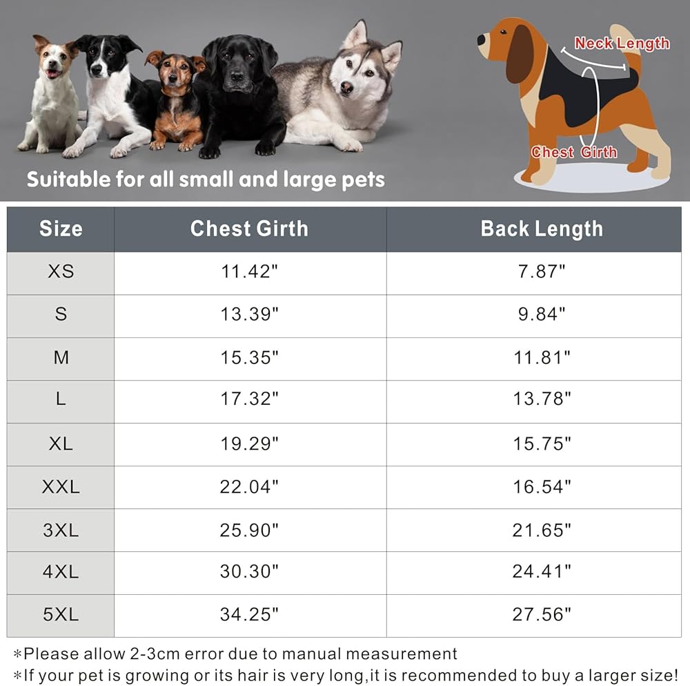 9 Sizes: This dog hoodie comes in 9 sizes which can fit almost dogs from small- large. Please follow the size chart based on your pet chest to find a perfect size for your pet.