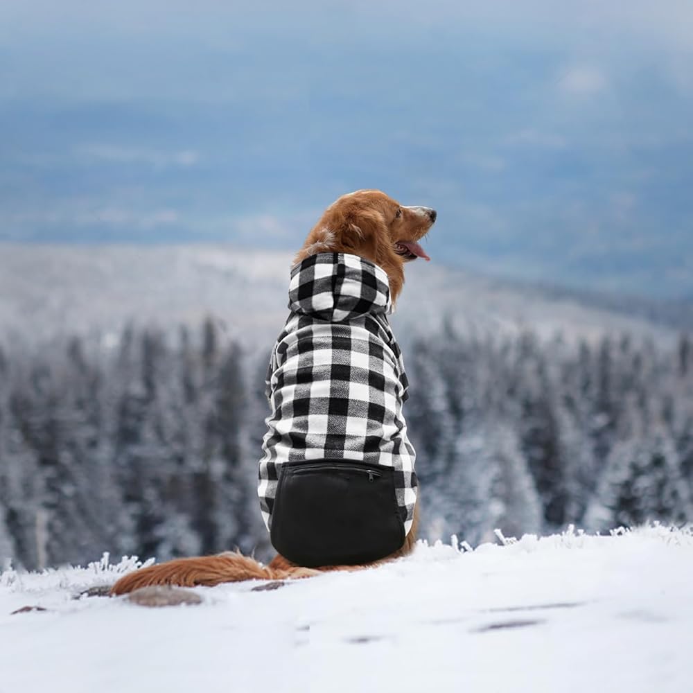 Super Plaid & Pocket Design: This dog sweatshirts large designed with classic plaid(red & black/black&white/blue & black), perfect for Christmas/New Year party and also suit for daily wear. The zipper pocket can hold snacks and poop bags, convenient for outdoor activities.
